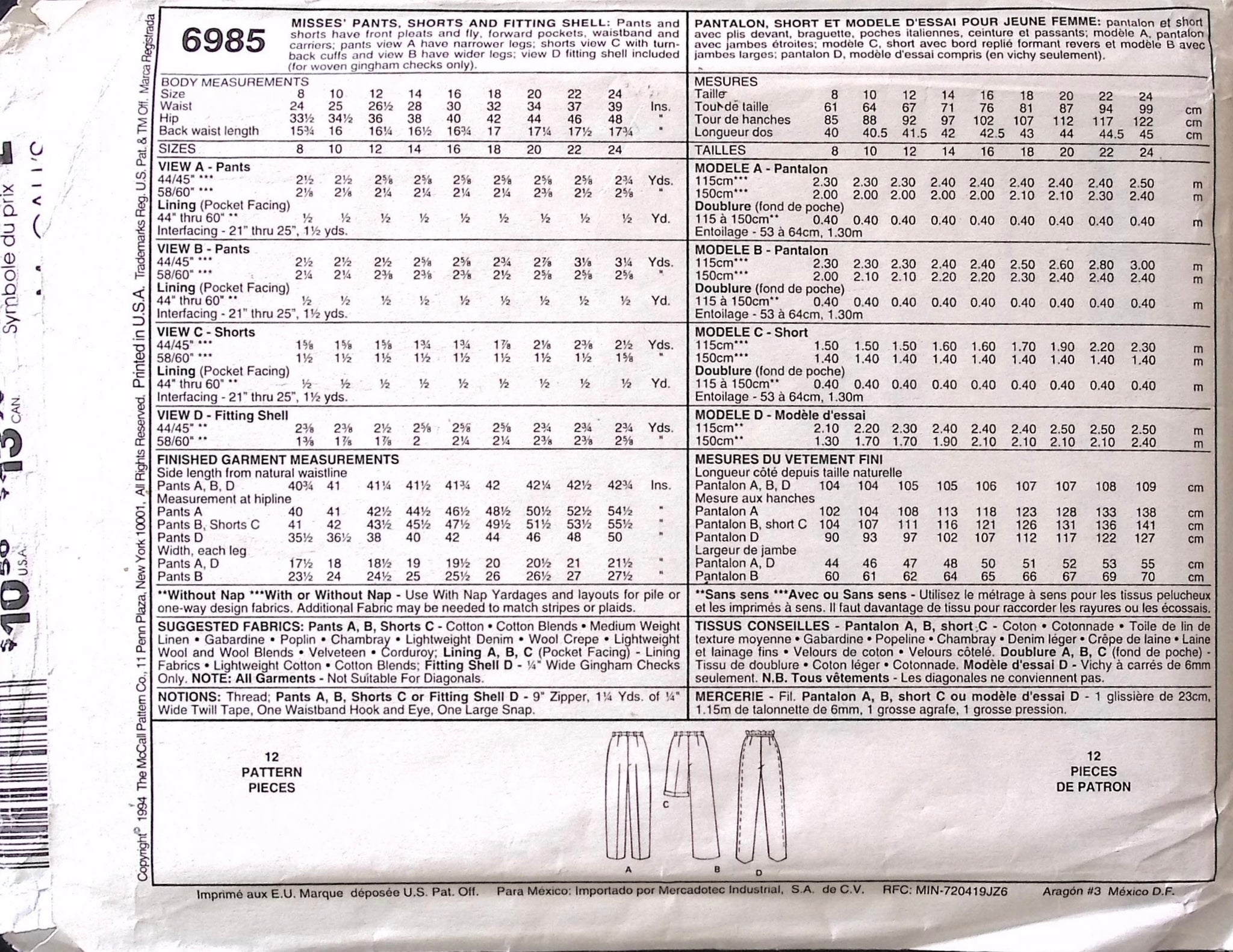 Misses' Pants & Shorts: Designed by Palmer Pletsch: Both pants and shorts feature front pleats, a fly, forward pockets, waistband, and carriers. For a contemporary look, choose pants in View A with narrower legs, or opt for shorts in View C with turn-back cuffs. If a wider-legged style is preferred, View B offers a fashionable alternative. The pattern includes a fitting shell in View D, ensuring that your final creation achieves the ideal fit. Elevate your wardrobe with this versatile pattern, blending comfort and style in every stitch. ©1994.