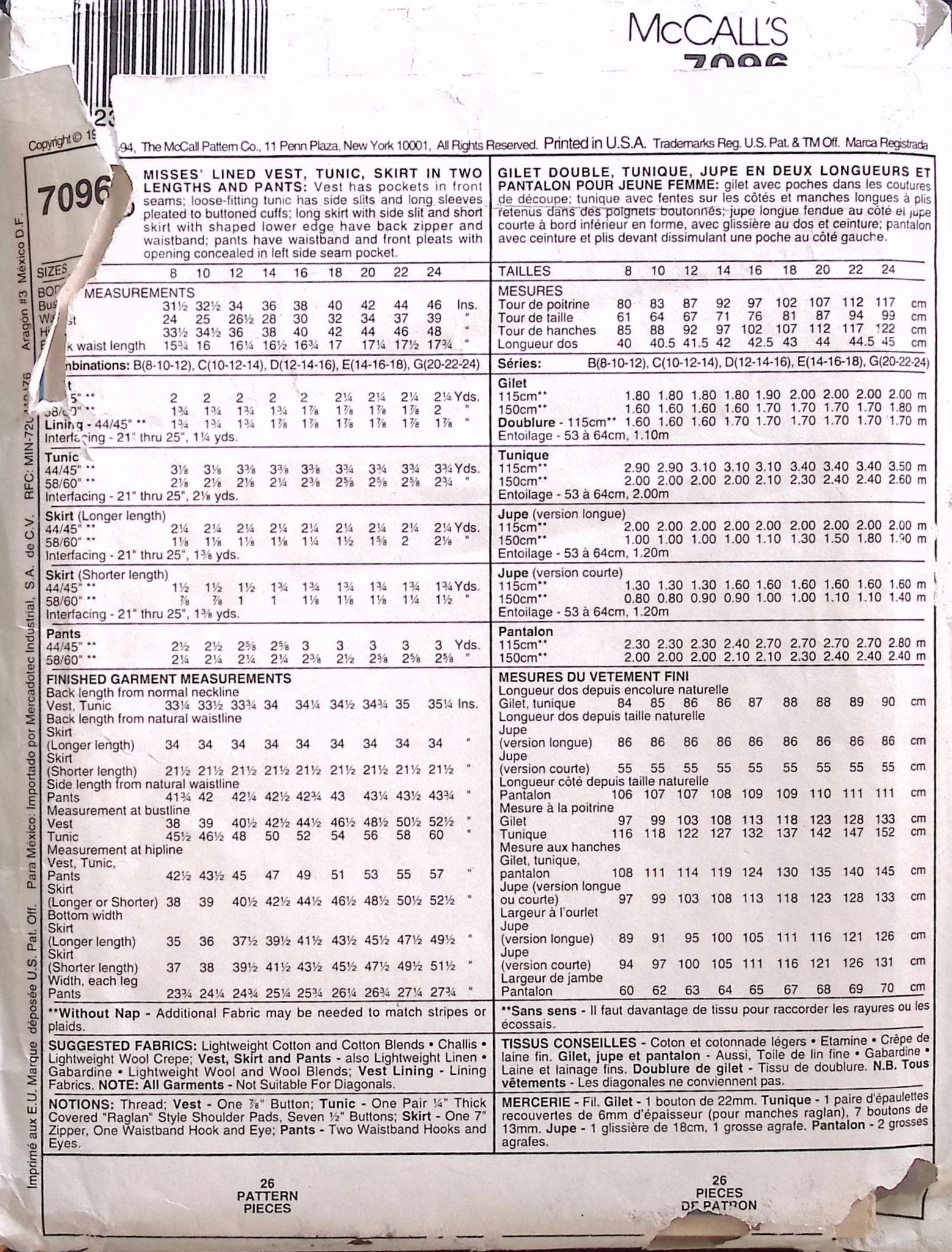 Misses’ Vest, Tonic, Skirt & Pants: Designed for Jones New York: A versatile ensemble that combines comfort and style. The vest features pockets in the front seams for added functionality. The loose-fitting tunic boasts side slits and long sleeves pleated to buttoned cuffs, offering a chic and relaxed look. Choose between a long skirt with a side slit or a short skirt with a shaped lower edge, both featuring a back zipper and waistband for a tailored finish. The pants are designed with a waistband, front pleats, and an opening concealed in the left side seam pocket for a seamless appearance. Elevate your wardrobe with this pattern, providing a variety of options to suit your personal style. ©1994.