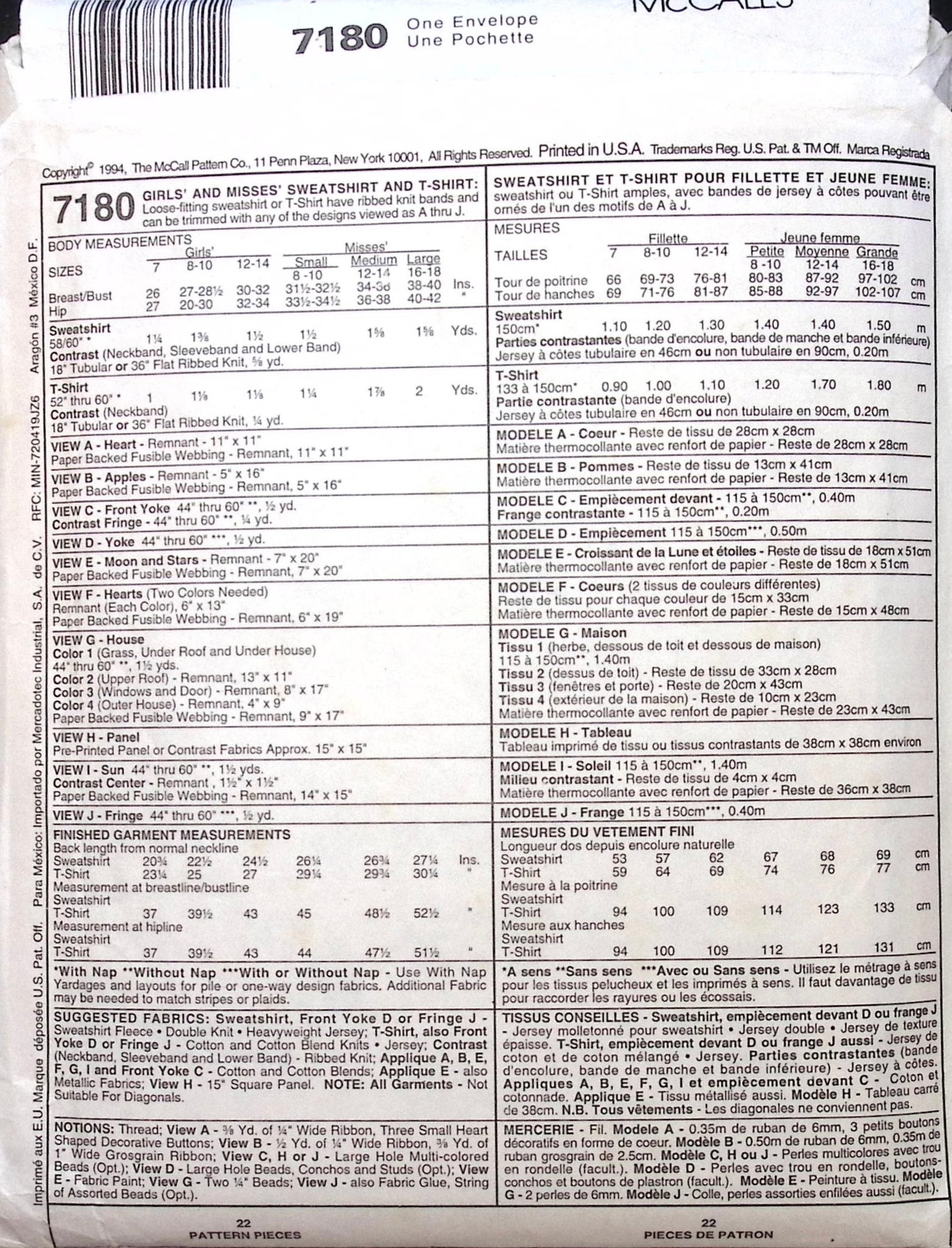 Misses' & Girl's T-Shirt & Sweatshirt: Get cozy in this vintage sweatshirt and T-shirt combo! The loose fit and ribbed knit bands will keep you comfortable all day. With a variety of fun designs to choose from, you'll be the talk of the town. Don't miss out on this unique pattern from McCalls 7180! ©1994.