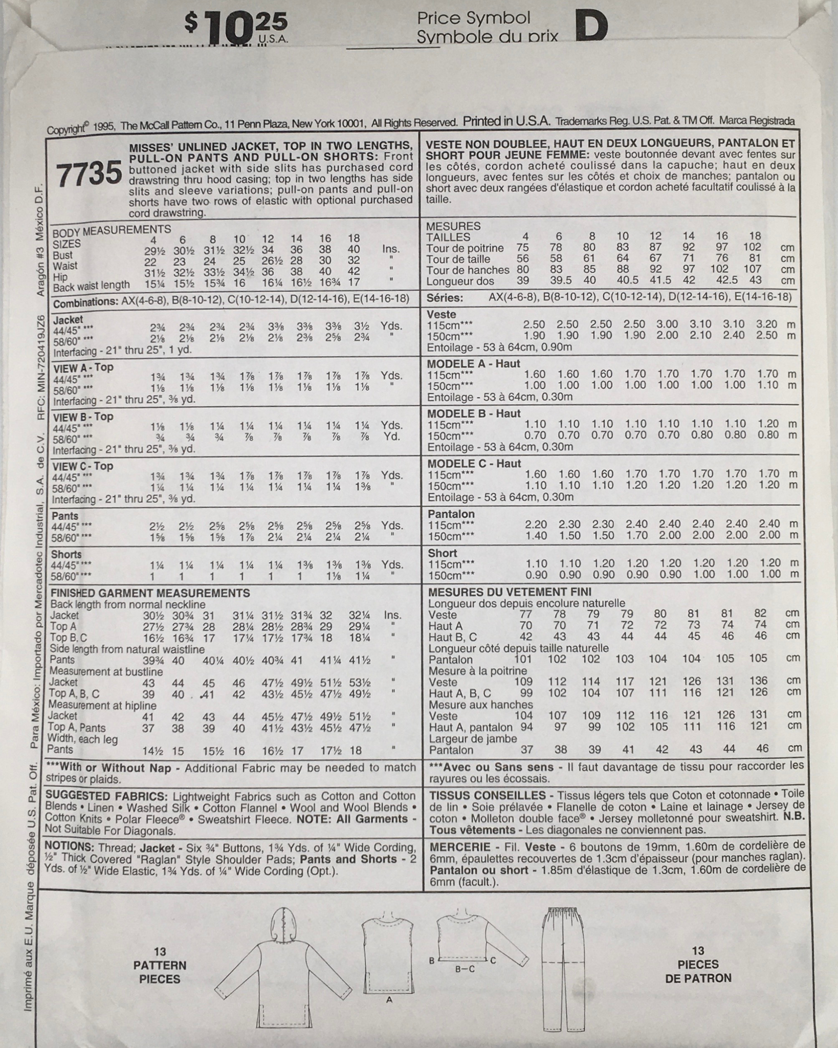 Misses' Unlined Jacket, Top (Two Lengths), Pull-On Pants, and Shorts: This pattern offers a front-buttoned jacket featuring side splits with a convenient cord drawstring through the hood casing. The tops come in two different lengths, both featuring side slits and sleeve variations. Additionally, there are pull-on pants and shorts designed for comfort, featuring double rows of elastic and an optional purchased drawstring. ©1995.