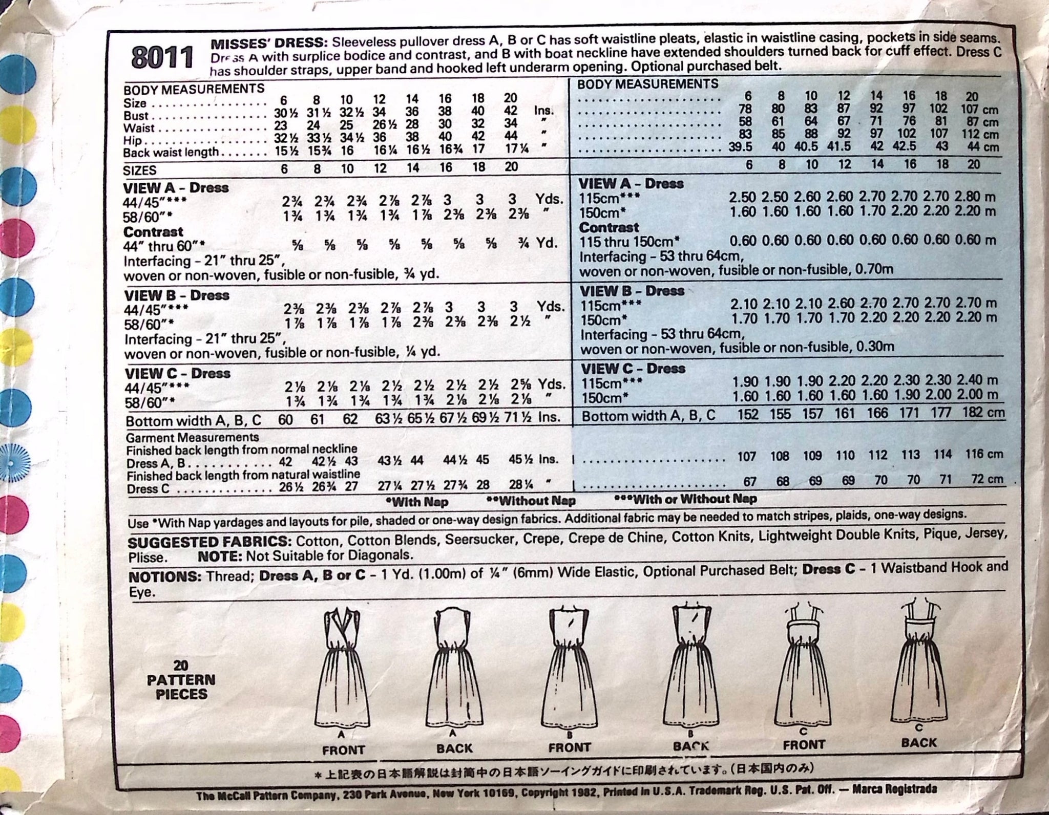 Misses’ Dress: Soft waistline pleats create a flattering silhouette, while elastic at the waistline ensures a comfortable fit. The dress features practical pockets in the side seams, adding functionality to its chic design. With various neckline variations or the option for shoulder straps, you can customise the dress to suit your style preferences. Whether for a casual day out or a special occasion, this pattern provides versatility and charm. ©1982.