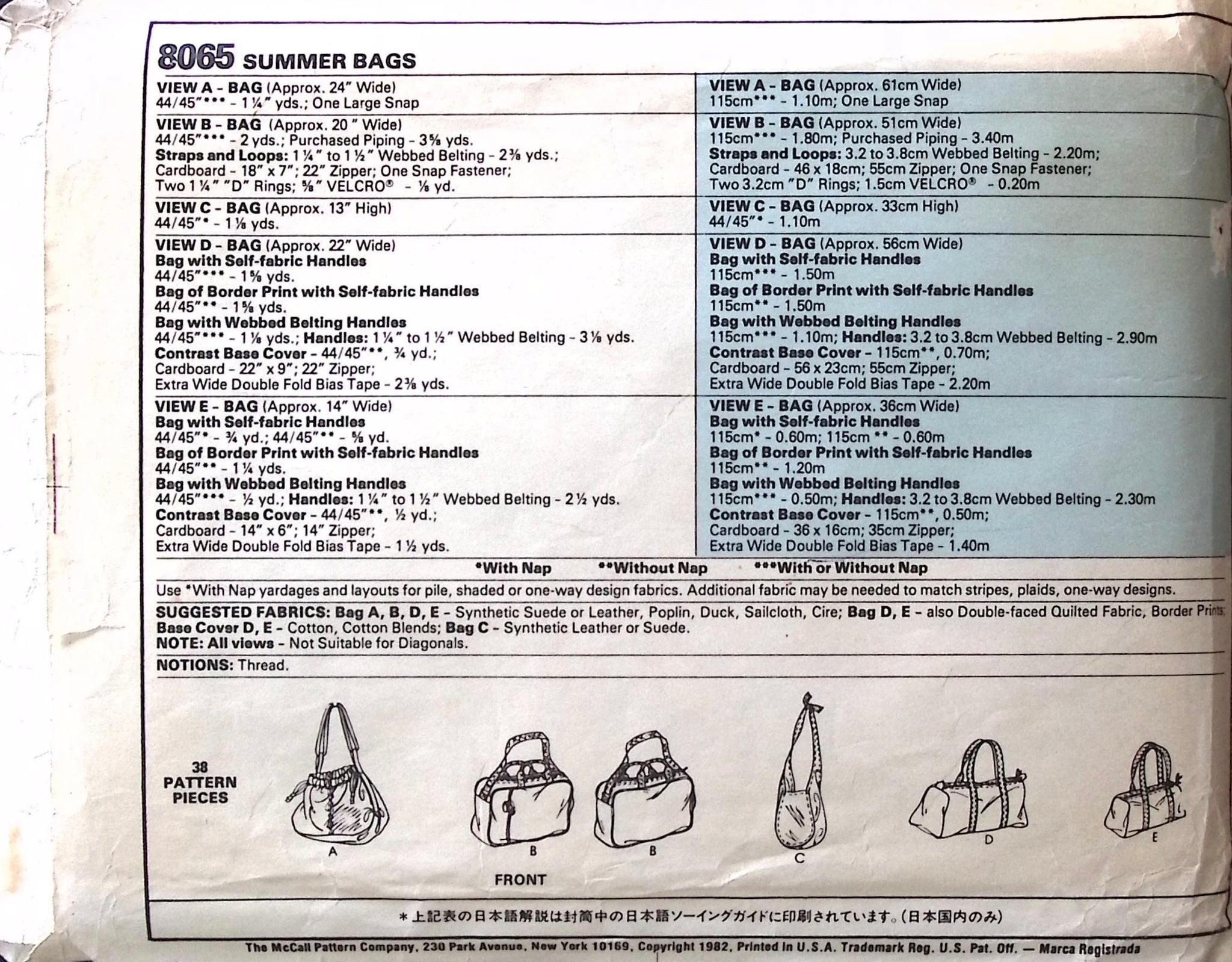 Summer Bags: Whether you need a tote for a day at the beach, a stylish purse for running errands, or a convenient carry-on for your travels, this pattern has you covered. With various shapes, sizes, and styles to choose from, you can mix and match to create the perfect accessory for any occasion. ©1982.