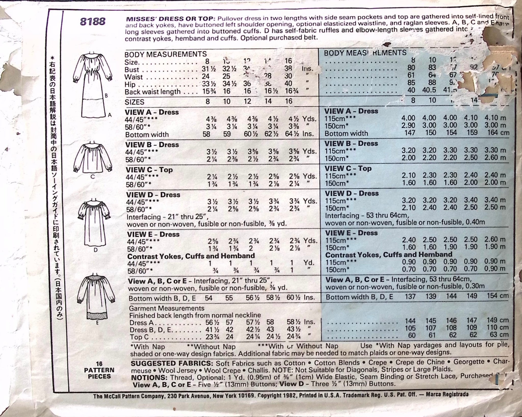 Misses’ Dress or Top: Both options feature convenient side seam pockets and are gathered into self-lined front and back yokes. The button left shoulder opening adds a stylish detail, and there's the option to add an elastic waistline for extra comfort. Choose between long or short sleeves to suit your style and the season. ©1982.