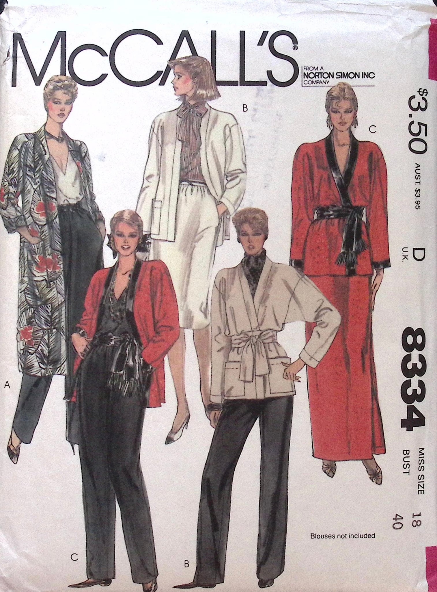 Misses' Kimono, Skirt, Pants & Sash: Transform into a fashion icon with this retro sewing pattern: McCalls 8334. Create a stylish look with a 80's kimono, knee or evening length skirt, pants, and sash. Perfect for any occasion - dress it up or keep it casual! ©1982. RARE FIND!