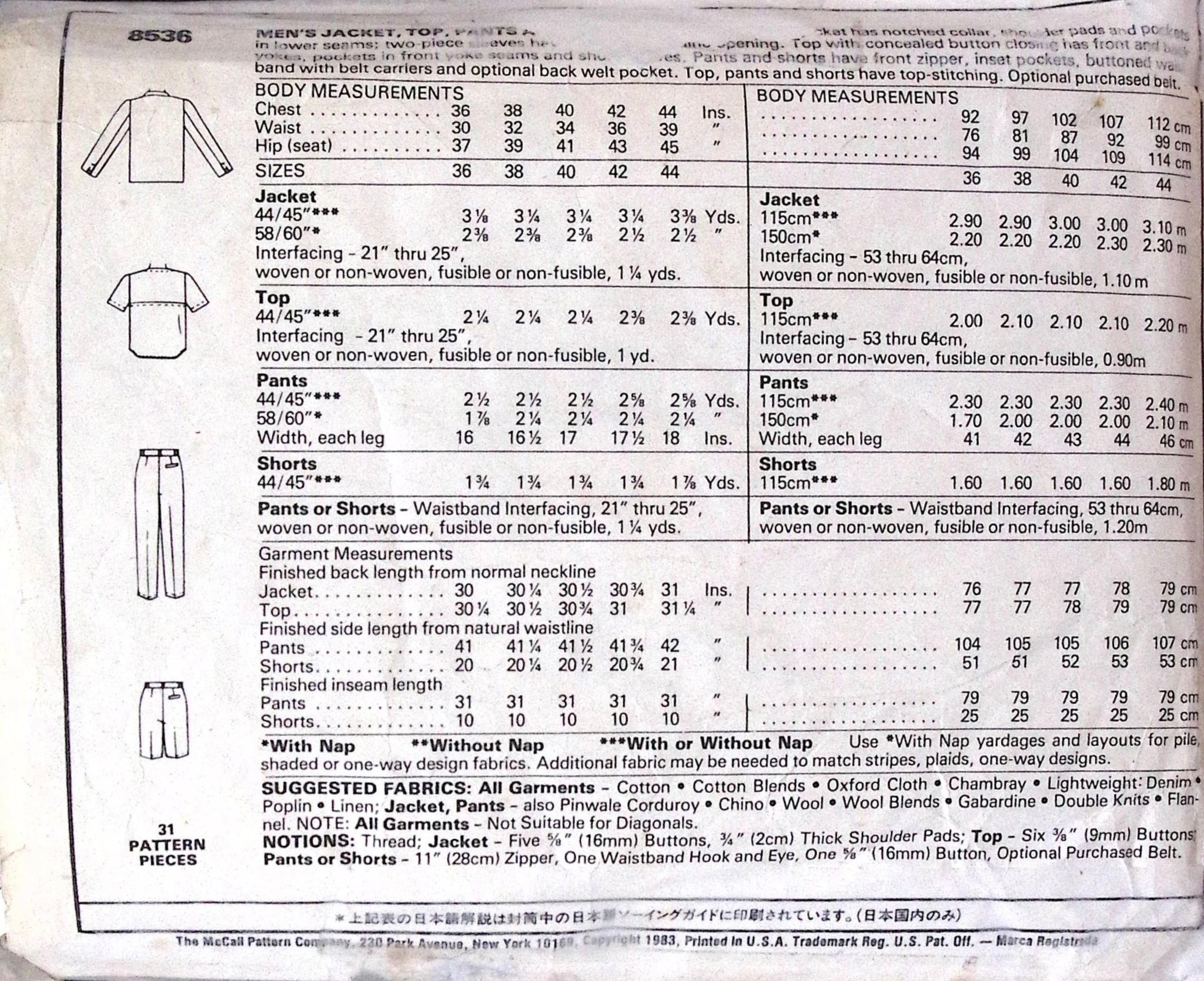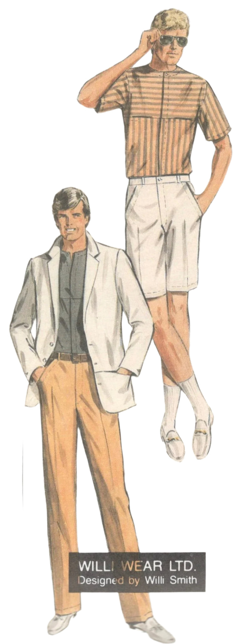 Men's Jacket & Top: Designed by Willi Smith: Get ready to rock a vintage look with this stylish sewing pattern! The unlined jacket features a notched collar and functional pockets, while the top has a cool concealed button closure and unique front yoke seams. The matching pants and shorts have all the bells and whistles, including a front zipper and top-stitching. Perfect for the fashion-forward man (or woman) who loves a classic, retro vibe. ©1983.