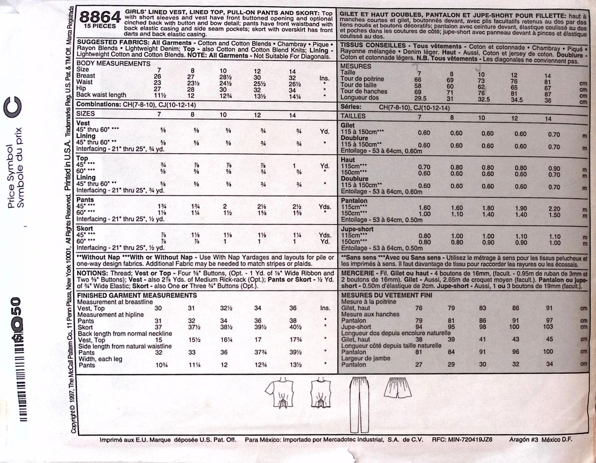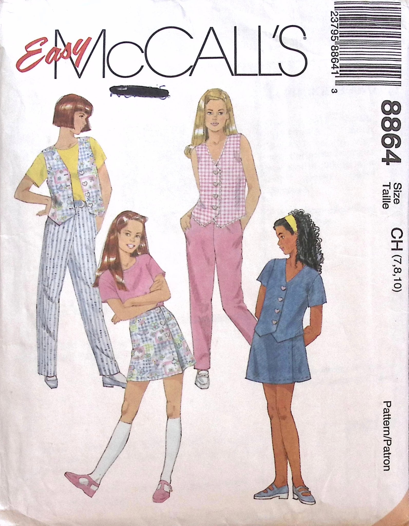 Girl's Vest, Top, Pants & Skort: Rock your retro style with this Vintage Sewing Pattern from McCalls 8864! Choose between a lined vest or top with cute button and bow details, and comfortable pull-on pants or a flirty skort with an oversized skirt. Perfect for adding a touch of fun and nostalgia to your wardrobe. (Bow-tiful!) ©1997.