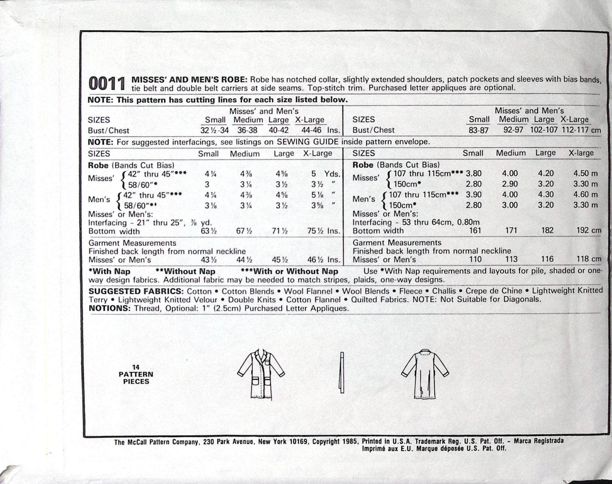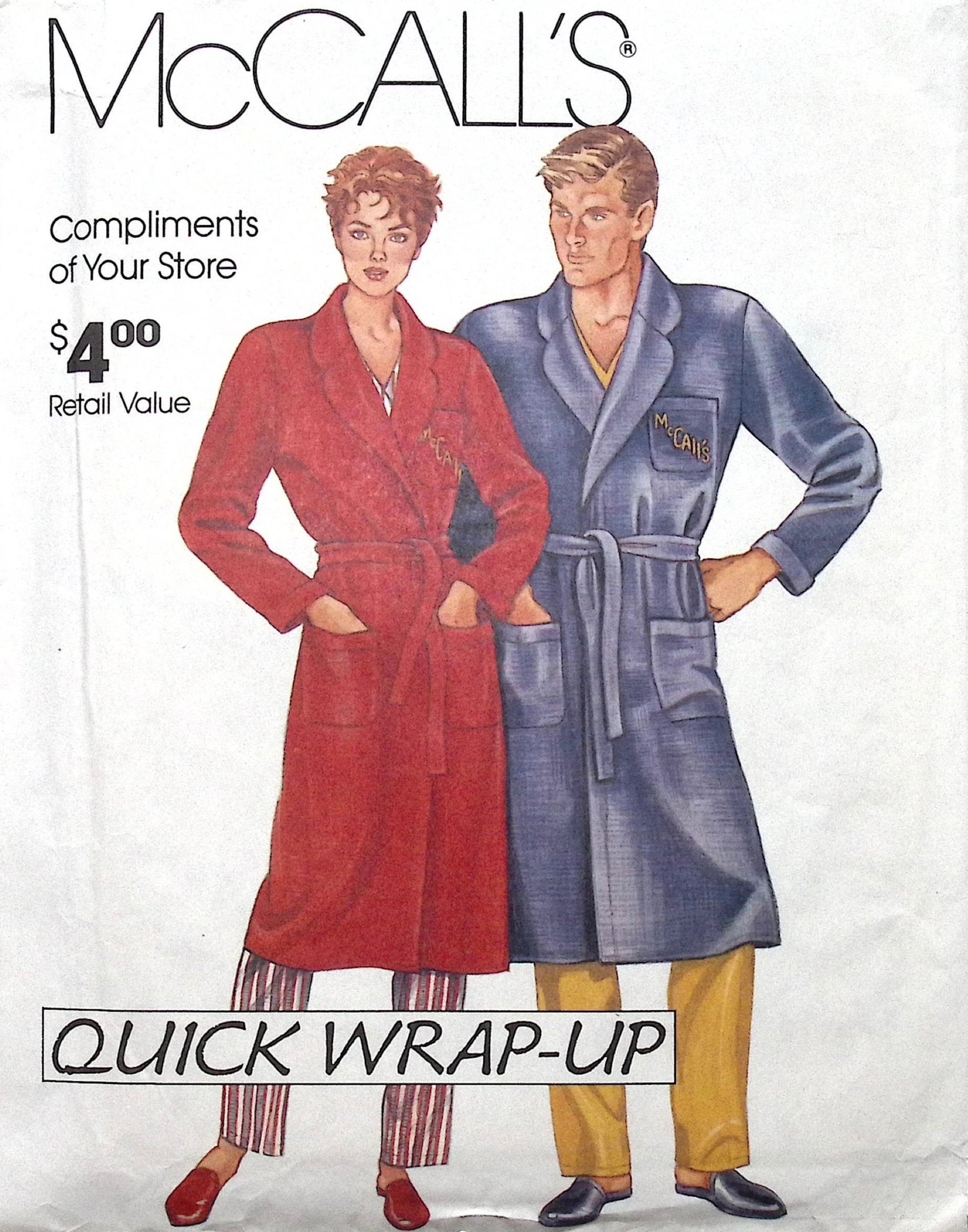Misses’ & Men’s Robe: A stylish and comfortable sewing pattern for a robe featuring a notched collar, patch pockets, and sleeves with bias bands. The robe is cinched at the waist with a tie belt and double belts at the side seams, with optional purchased letter appliques for customization. Perfect for adding a touch of elegance to your loungewear, this robe is both practical and stylish, making it a versatile addition to any wardrobe. ©1985.