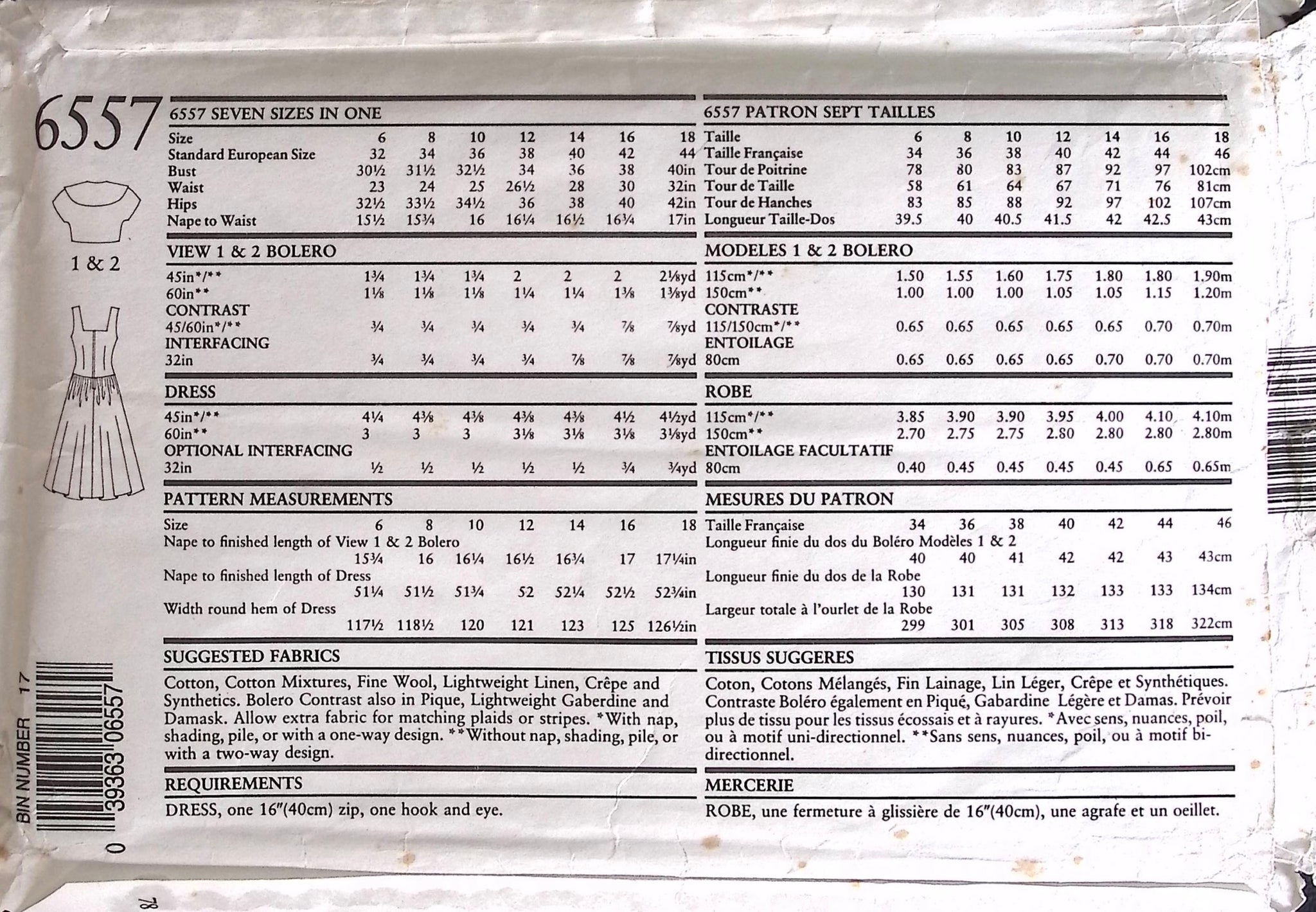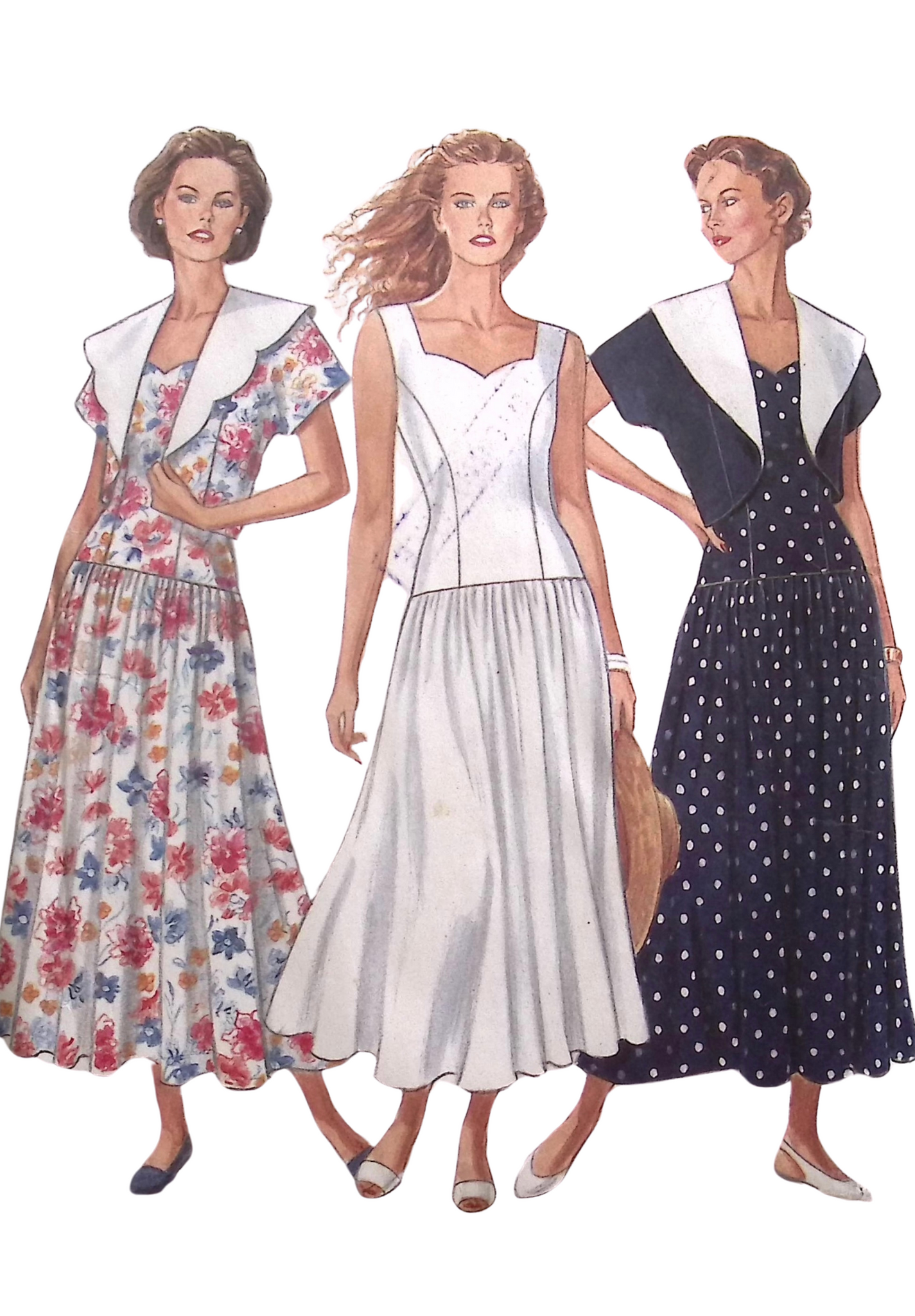 Misses' Dress & Bolero: The dress features a fitted bodice and a charming sweetheart neckline, leading to a dropped waist with a full skirt that gracefully falls below the knee. Accompanying this stylish ensemble is a bolero with two collar variations, allowing you to add a personalised touch to your outfit. Embrace the nostalgia of the '80s and create a timeless dress and bolero set with this unique and classic sewing pattern. ©1980's.