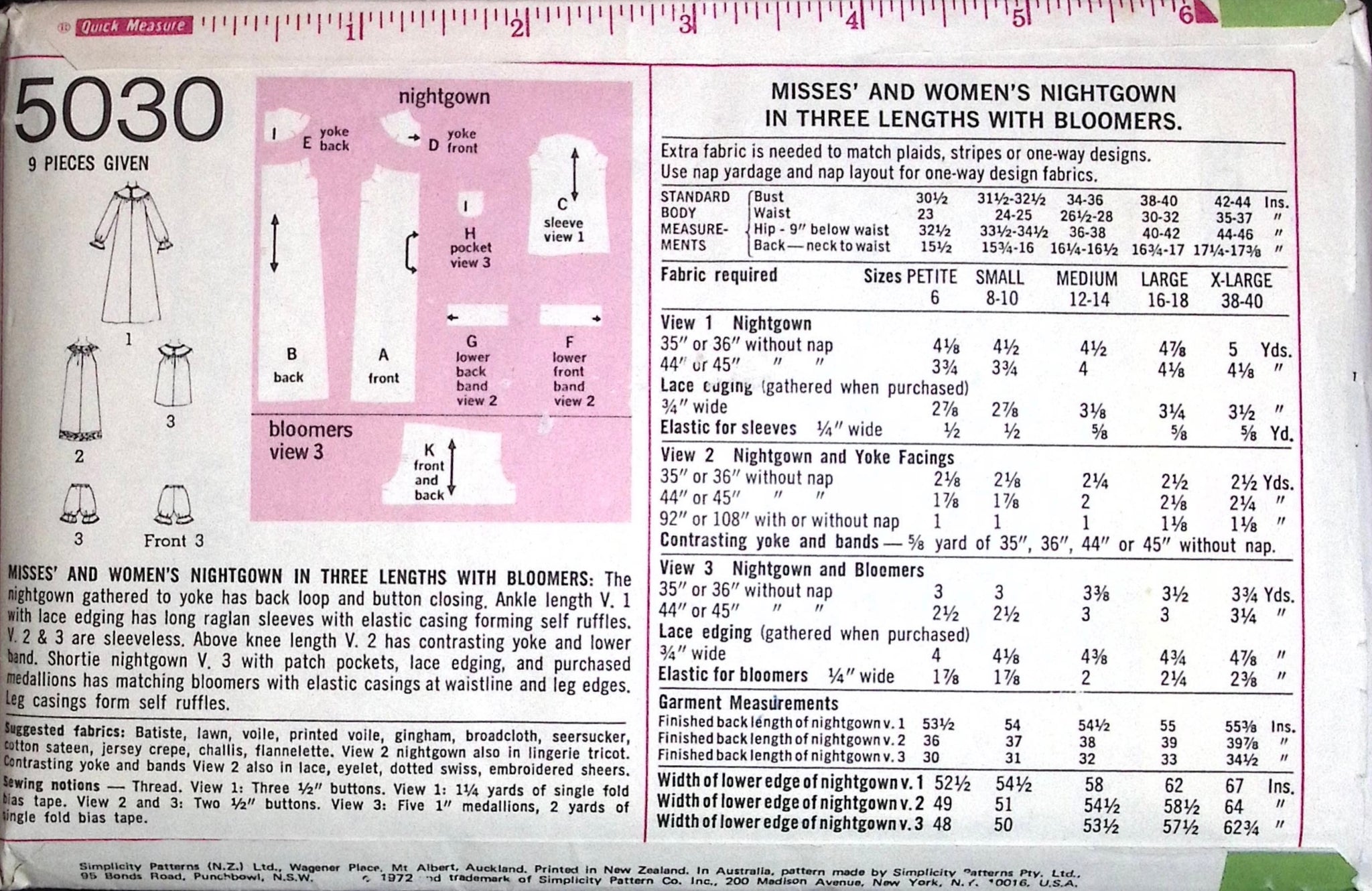 Misses' & Women's Nightgown in Three Lengths with Bloomers: The nightgown, gathered to the yoke, features a charming back loop and button closing for added detail. Opt for ankle-length, adorned with lace edging and long raglan sleeves with elastic casing forming self ruffles, or a sleeveless option, in an above-knee length showcasing a contrasting yoke and lower band. The shortie nightgown, boasting patch pockets, lace edging, and purchased medallions, pairs seamlessly with matching bloomers featuring elastic casings at the waistline and leg edges. The leg casings form self ruffles, creating a delightful ensemble that captures the nostalgic charm of the era. ©1972.