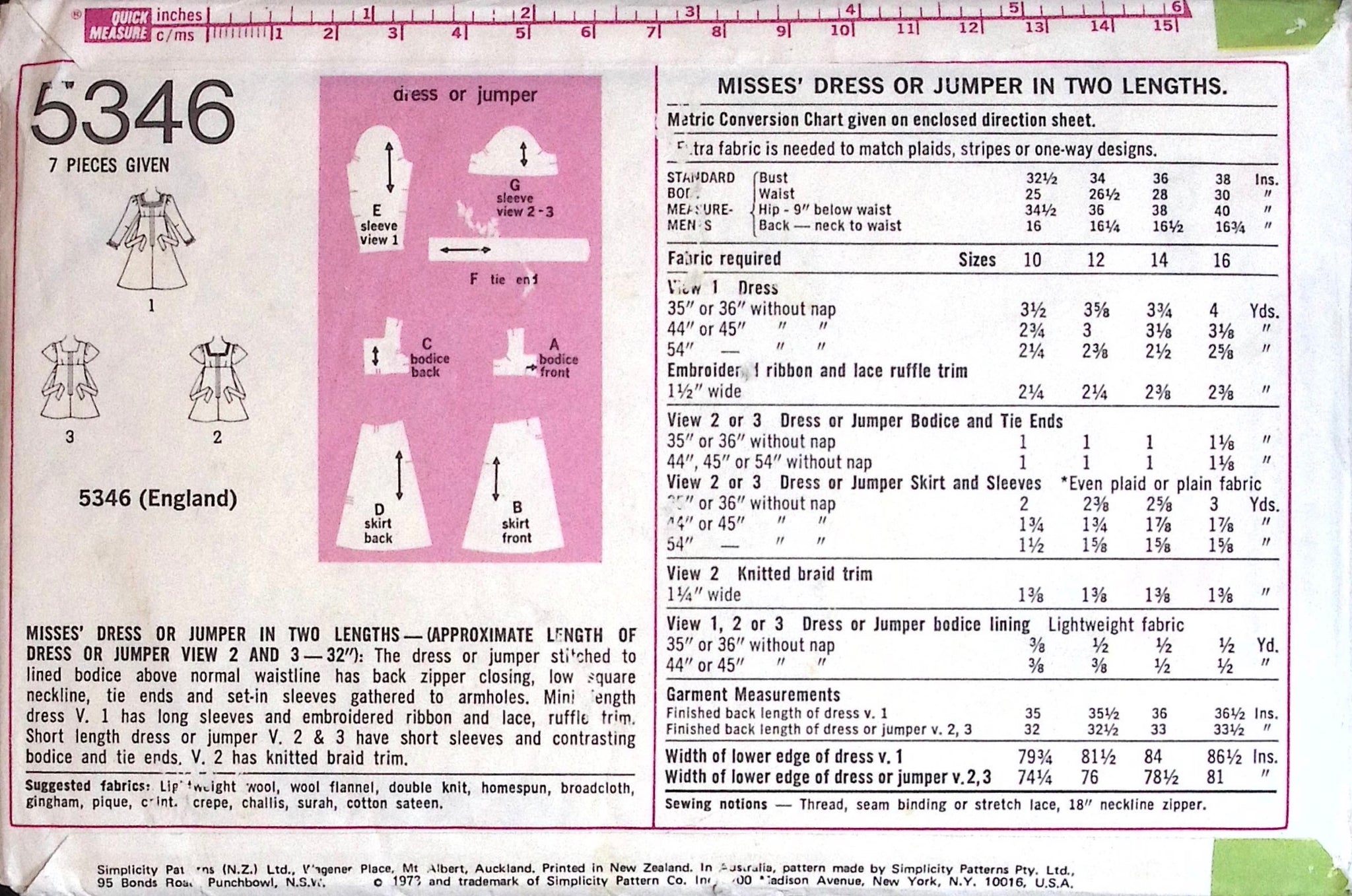 Misses’ Dress or Jumper: Featuring a lined bodice above the natural waistline, these garments boast a low square neckline, tie ends, and set-in sleeves gathered to armholes. Opt for a mini-length dress with long sleeves and embellished with embroidered ribbon and lace ruffle trim, or go for a short-length version with short sleeves and contrasting bodice and tie ends. Perfect for capturing the retro charm of the era with a touch of personal flair. ©1973.