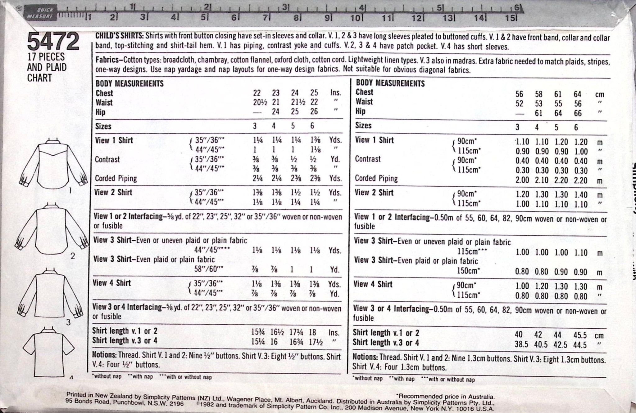 Child’s Shirts: A classic sewing pattern for child's shirts with front button closures, set-in sleeves, and collars. The shirts are available in long sleeves, pleated to button cuffs, or short sleeves. They feature top-stitching detail and shirt-tail ends for a polished finish. Perfect for creating timeless and stylish shirts for children. ©1982.