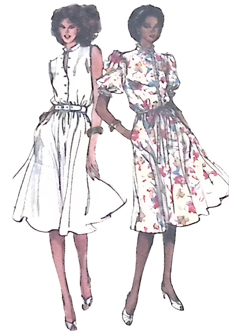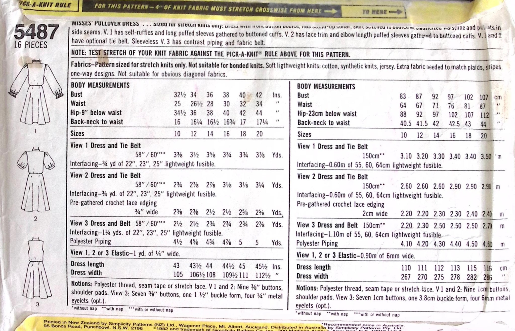 Misses' Dress: Designed by Butte Knit: Upgrade your wardrobe with this vintage sewing pattern. Create a dress with a stand-up collar and front button bodice, complete with pockets and an elasticised waistline for comfort. View 1 features self-ruffles and long puffed sleeves, while View 2 has delicate lace trim. Add your own personal touch with an optional tie belt. For a summery look, try View 3 with contrast piping and a fabric belt. ©1982. Designed for Stretch Knits Only!