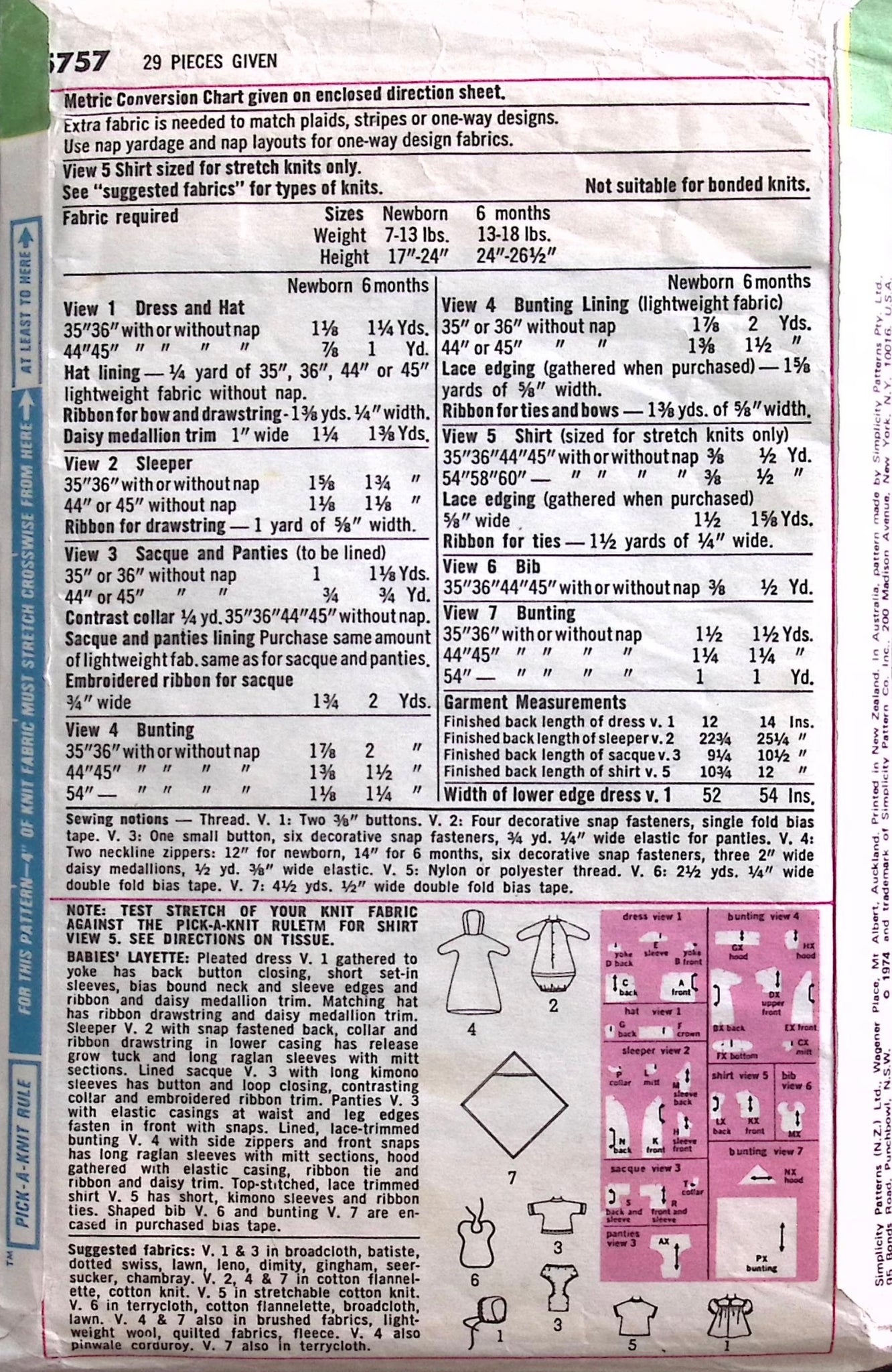 Babies’ Layette: This vintage pattern includes a pleated dress with ribbon daisy medallion trim, matching hat, sleeper with adjustable sizing, and lined sacque and bunting with delicate details. Keep your little one cozy and chic with these charming pieces. ©1974.