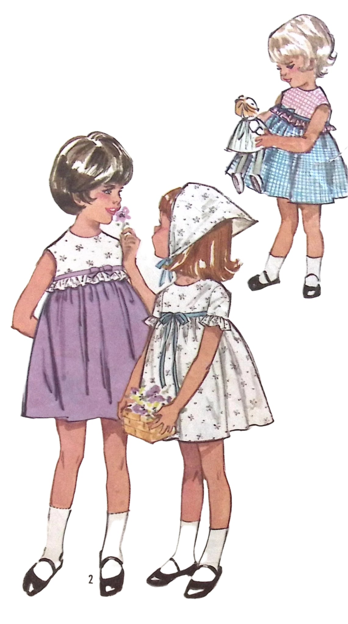 Child's Dress & Scarf: Revive your child's wardrobe with Simplicity 5860, a charming vintage sewing pattern from the 60's! This one-piece dress features a collarless design, gathered skirt, and back zipper closure for easy dressing. Option 1 includes self-ruffled sleeves and a matching scarf, while the sleeveless Option 2 offers a playful contrast yoke and ruffle. Perfect for creating unique and stylish outfits! ©1965.