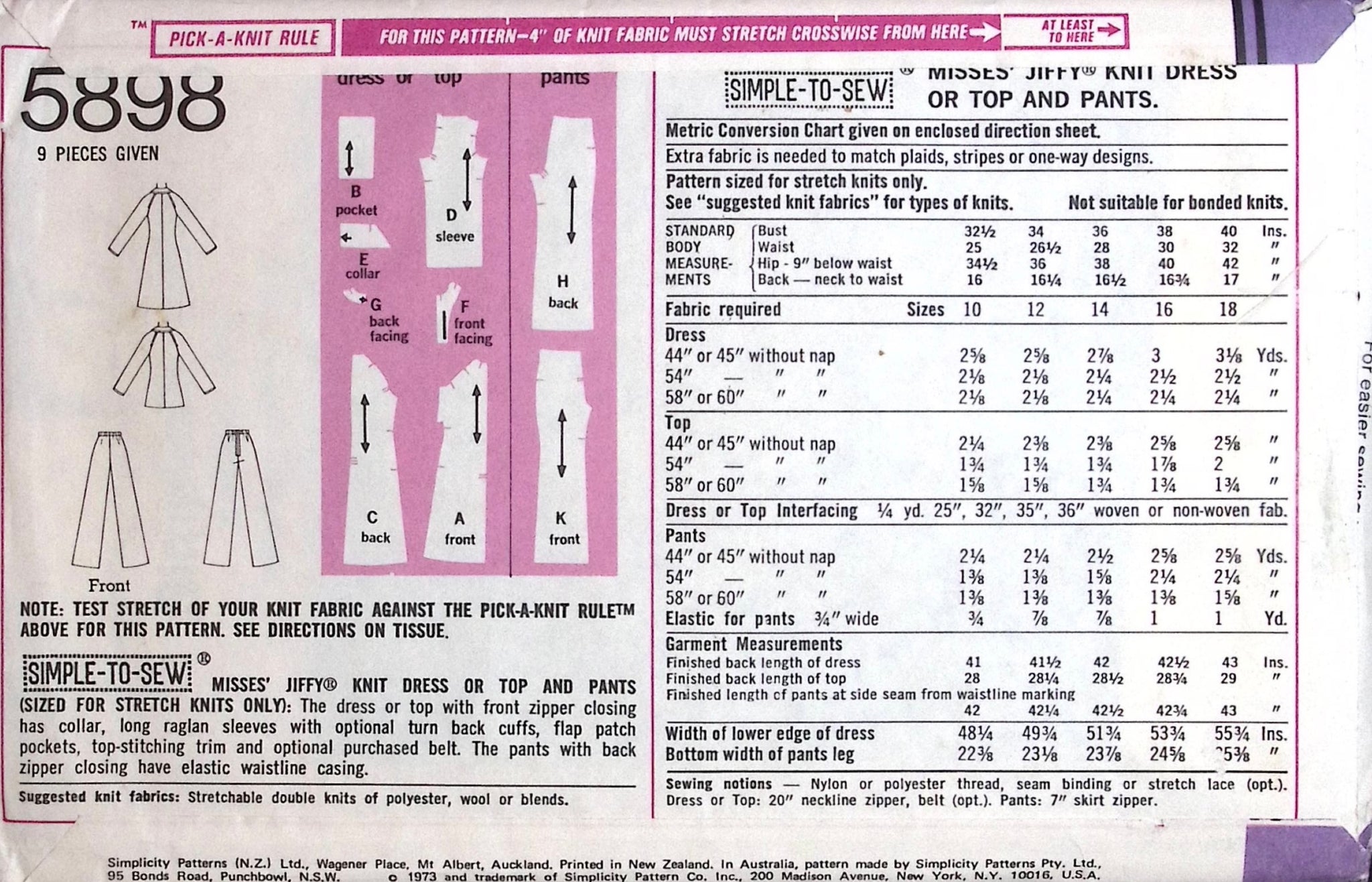 Misses’ Dress, Top & Pants: Designed for comfort and style with a retro twist. This versatile pattern offers options for a knit dress or top, both featuring a front zipper closure, collar, and long raglan sleeves with optional turn-back cuffs for a chic touch. Complete the look with flap patch pockets and topstitching trim for added flair. The accompanying pants feature a back zipper closure and an elastic waistline casing for easy wear and a comfortable fit. Whether you're dressing up or keeping it casual, this pattern provides endless possibilities for creating fashionable outfits with a vintage vibe. ©1973.