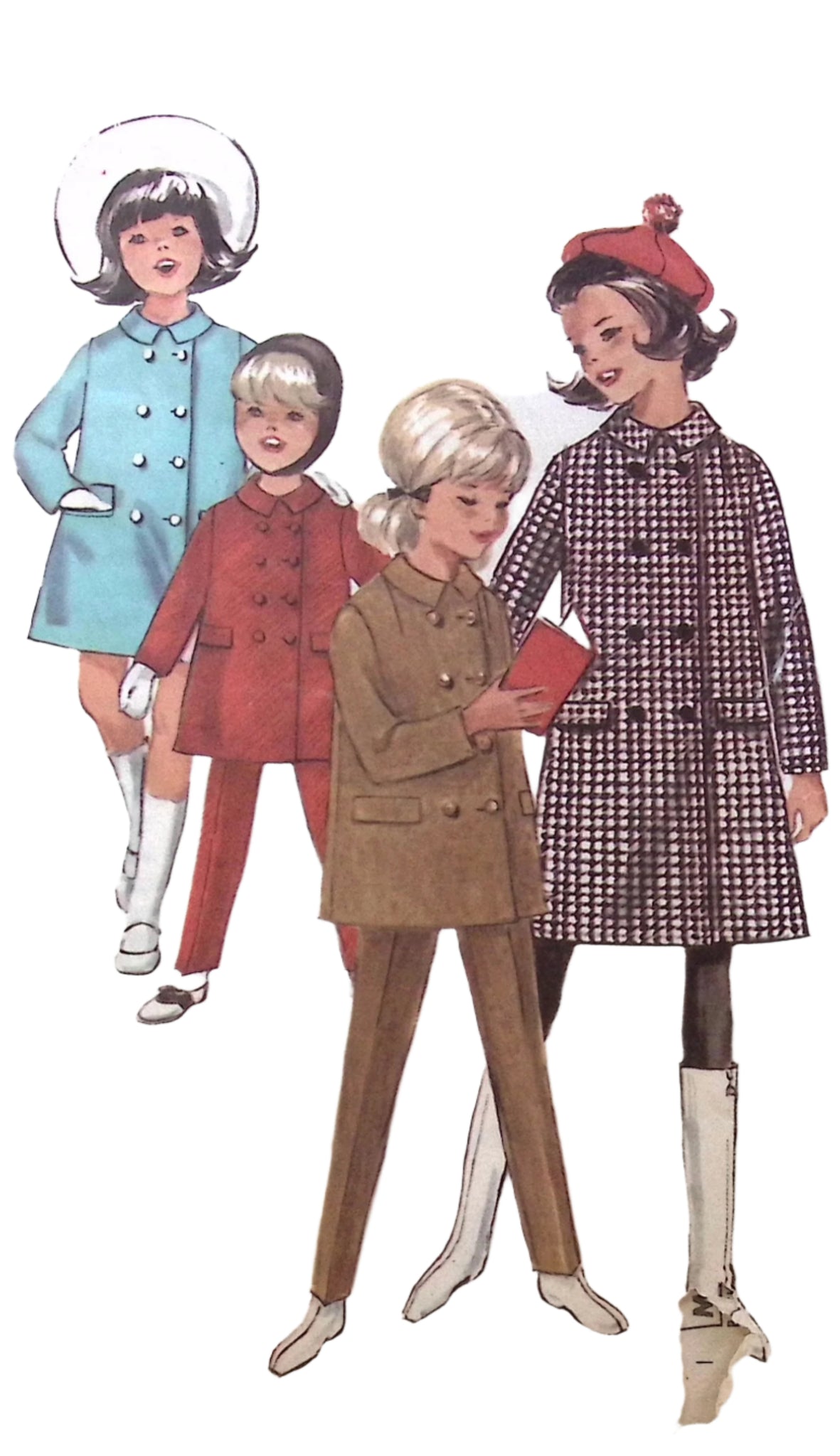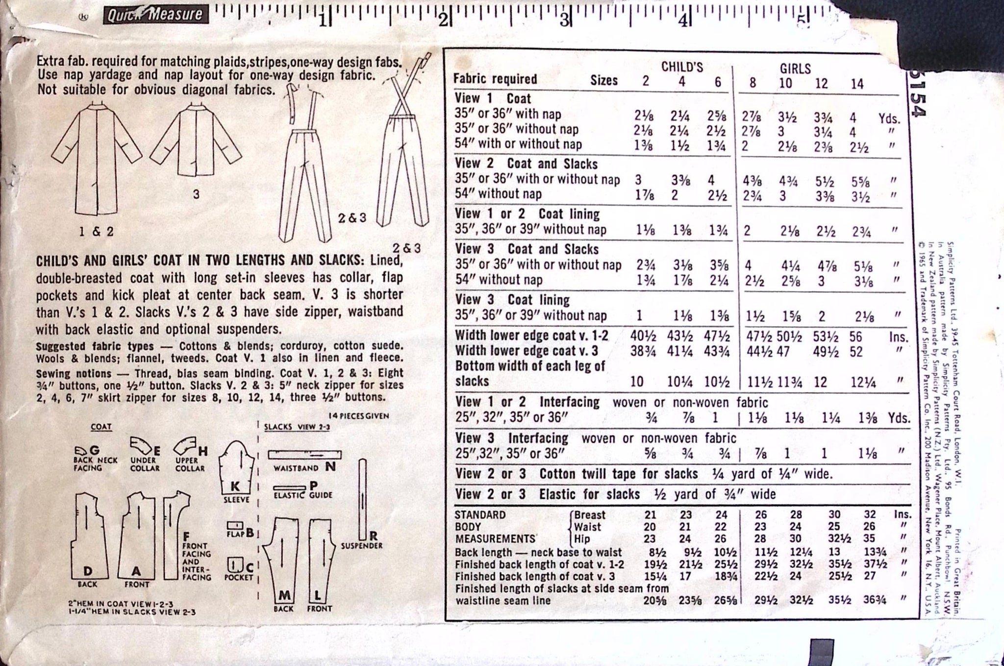 Child's Coat & Slacks: Get stylishly retro with our Simplicity 6154 sewing pattern! Create a timeless topcoat or jacket with a fun polo style, oh-so-chic stovepipe pants, and suspenders for that extra touch of vintage charm. Perfect for any fashion-forward young girl, this pattern is a must-have for any sewing enthusiast. ©1965. RARE FIND!
