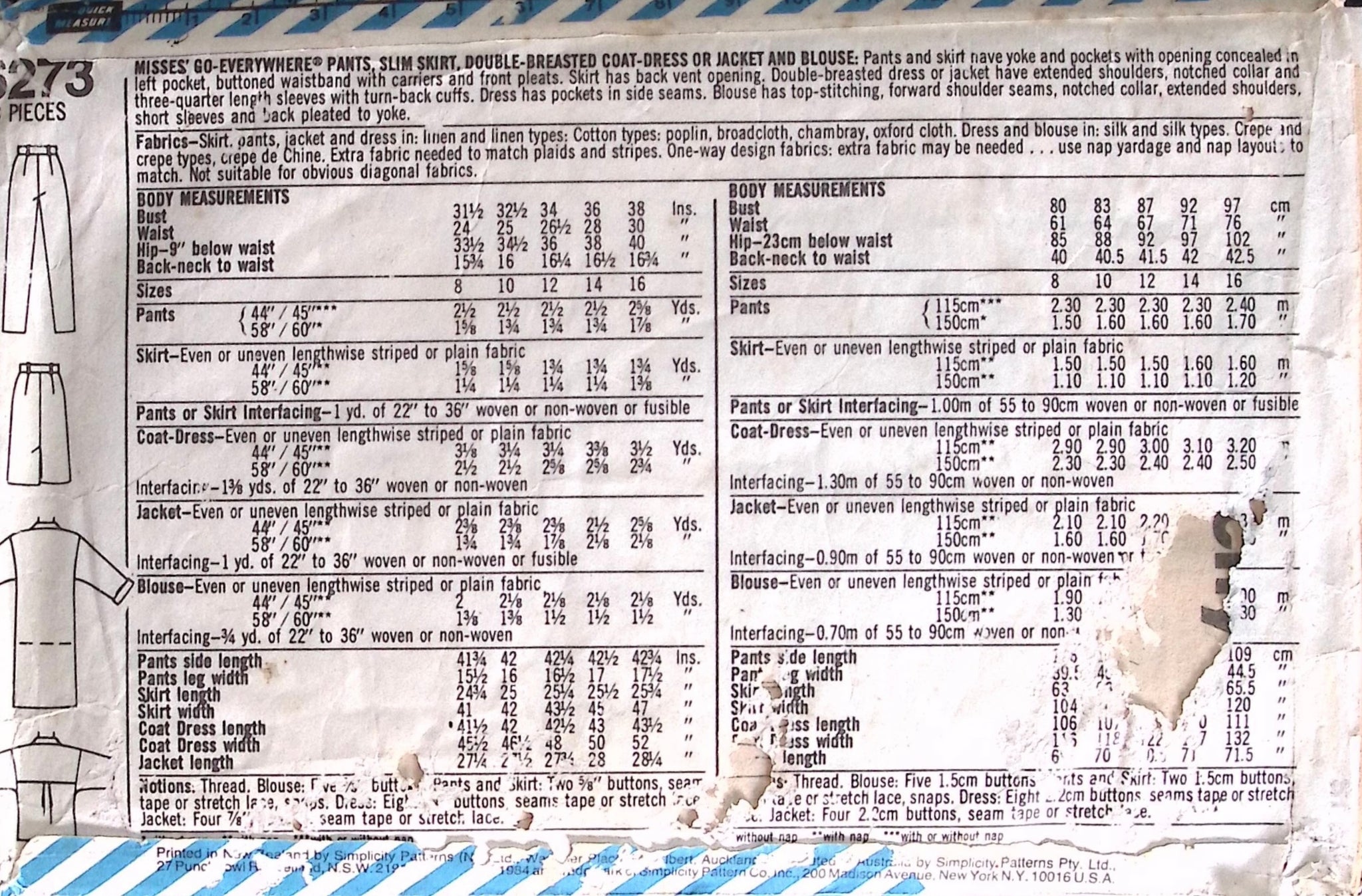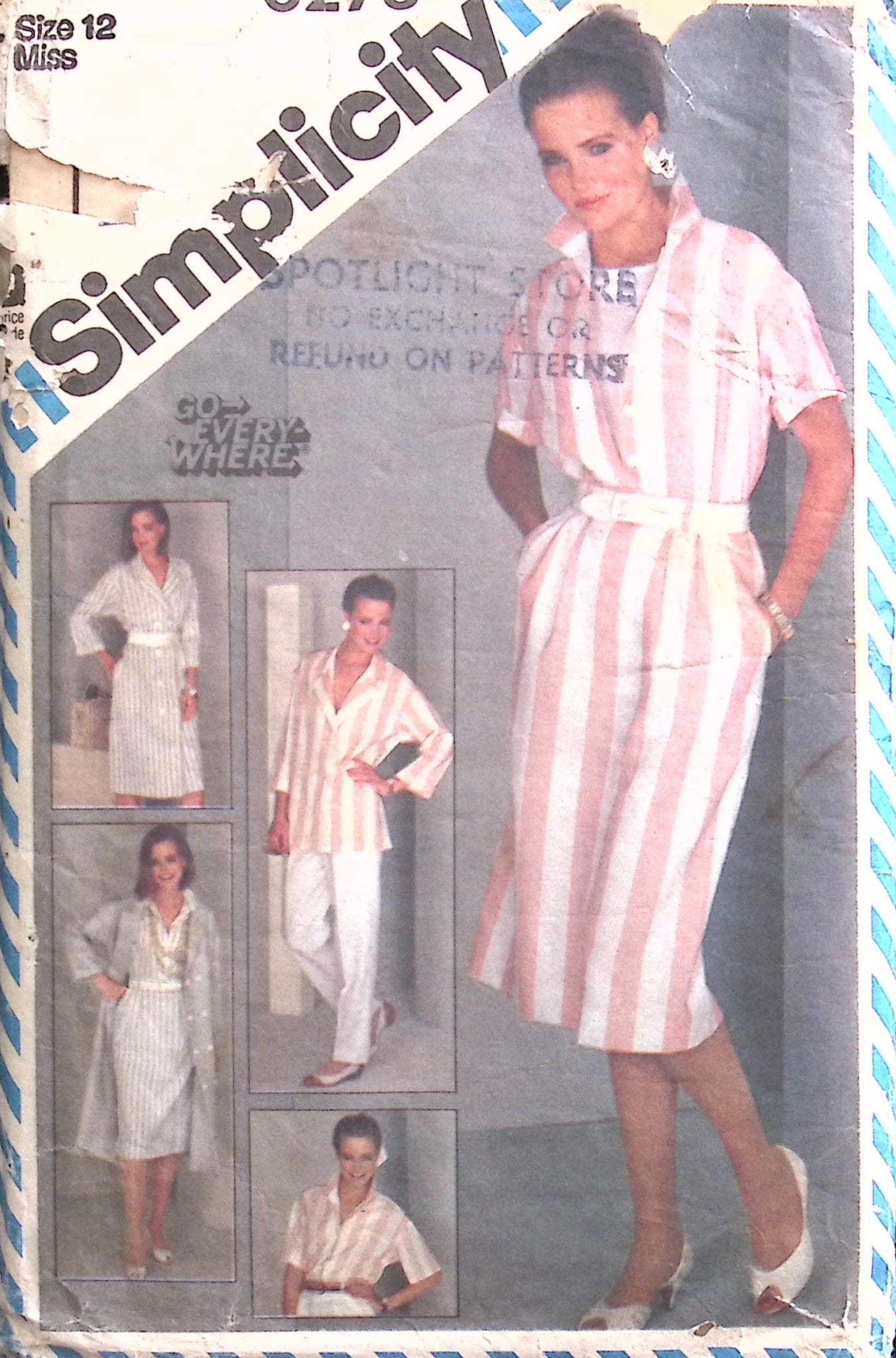 Misses’ Pants, Skirt, Coat-Dress, Jacket & Blouse: Step back in time with this versatile 80’s collection. Misses' Go-Everywhere Pants and Slim Skirt feature convenient pockets and stylish pleats. The Double-Breasted Coat-Dress or Jacket and Blouse add a touch of vintage charm with notched collars and extended shoulders. Elevate your wardrobe with this playful ensemble. ©1983.