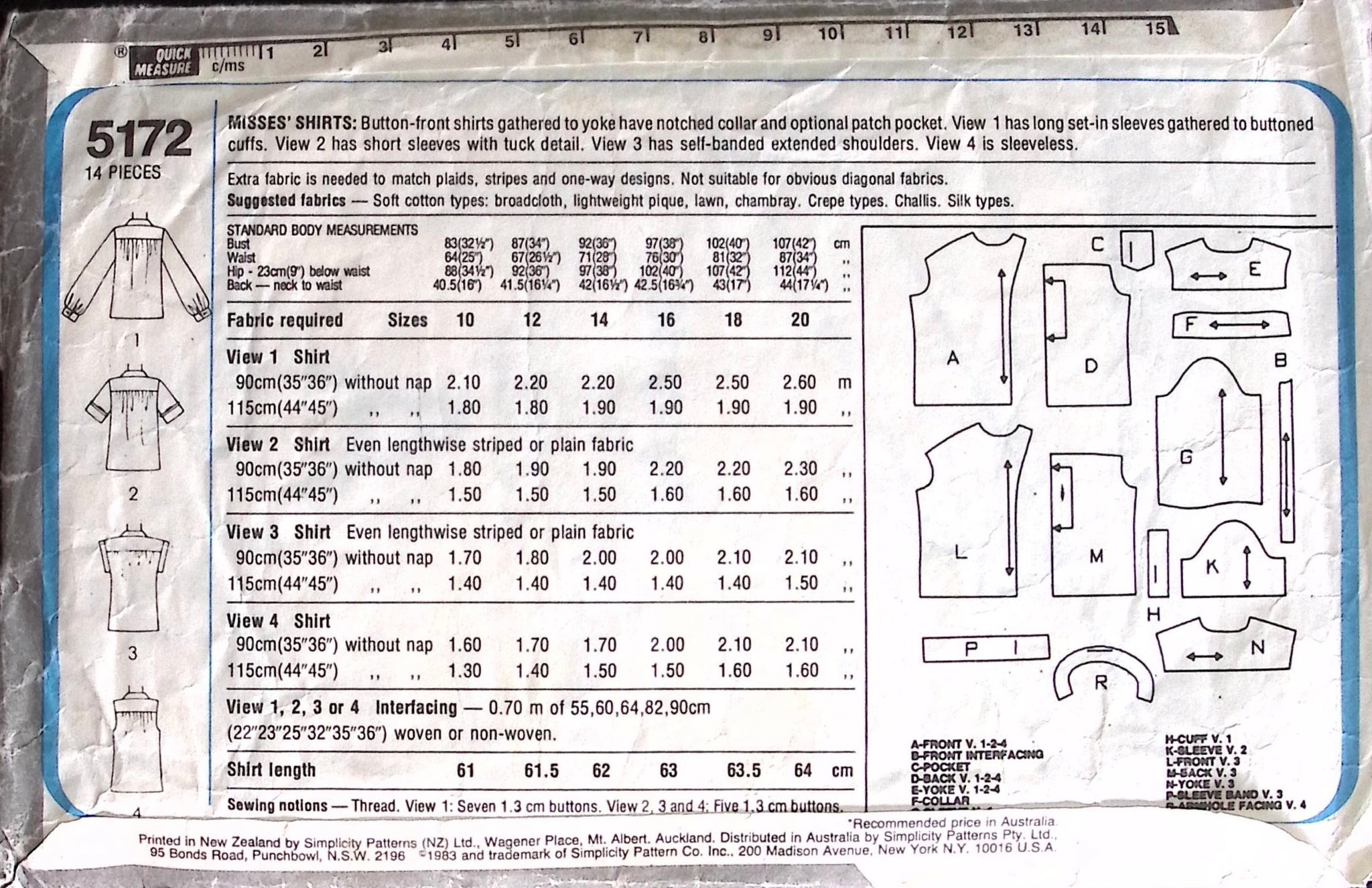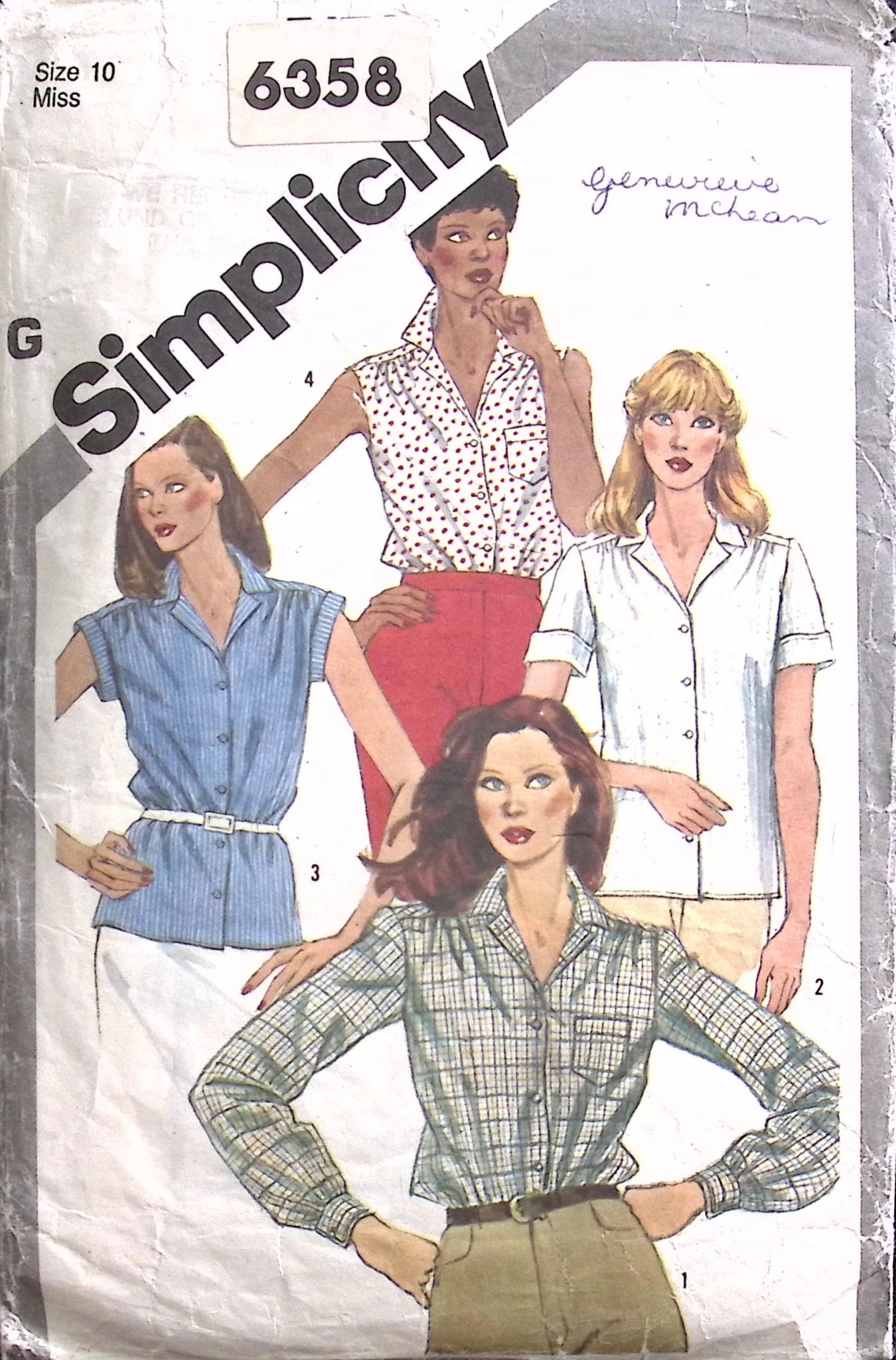 Misses’ Shirt: Create stylish vintage looks with this ’80's Shirt pattern! This button front shirt features a gathered yoke and notched collar, along with optional patch pocket. Choose from long or short sleeves with various cuff and band options. Perfect for playful outfits and retro vibes. ©1983.