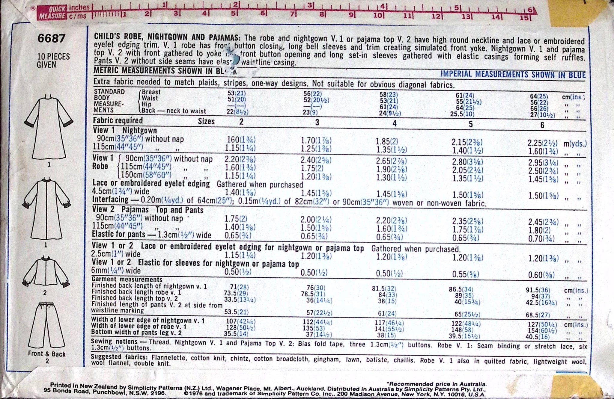 Child's Robe, Nightgown, and Pyjamas: Create cozy bedtime ensembles with this delightful sewing pattern. The robe and nightgown or pajama top feature a high round neckline adorned with lace or embroidered eyelet edging trim. The robe, with its front button closing, long bell sleeves, and simulated front yoke trim, offers a touch of elegance. The nightgown and pajama top, gathered to the yoke, boast a front button opening and long set-in sleeves with elastic casings forming self-ruffles. The pants, designed without outside seams, ensure comfort with an elastic waistline casing. Make bedtime special with these charming and comfortable sleepwear options for children. ©1976.