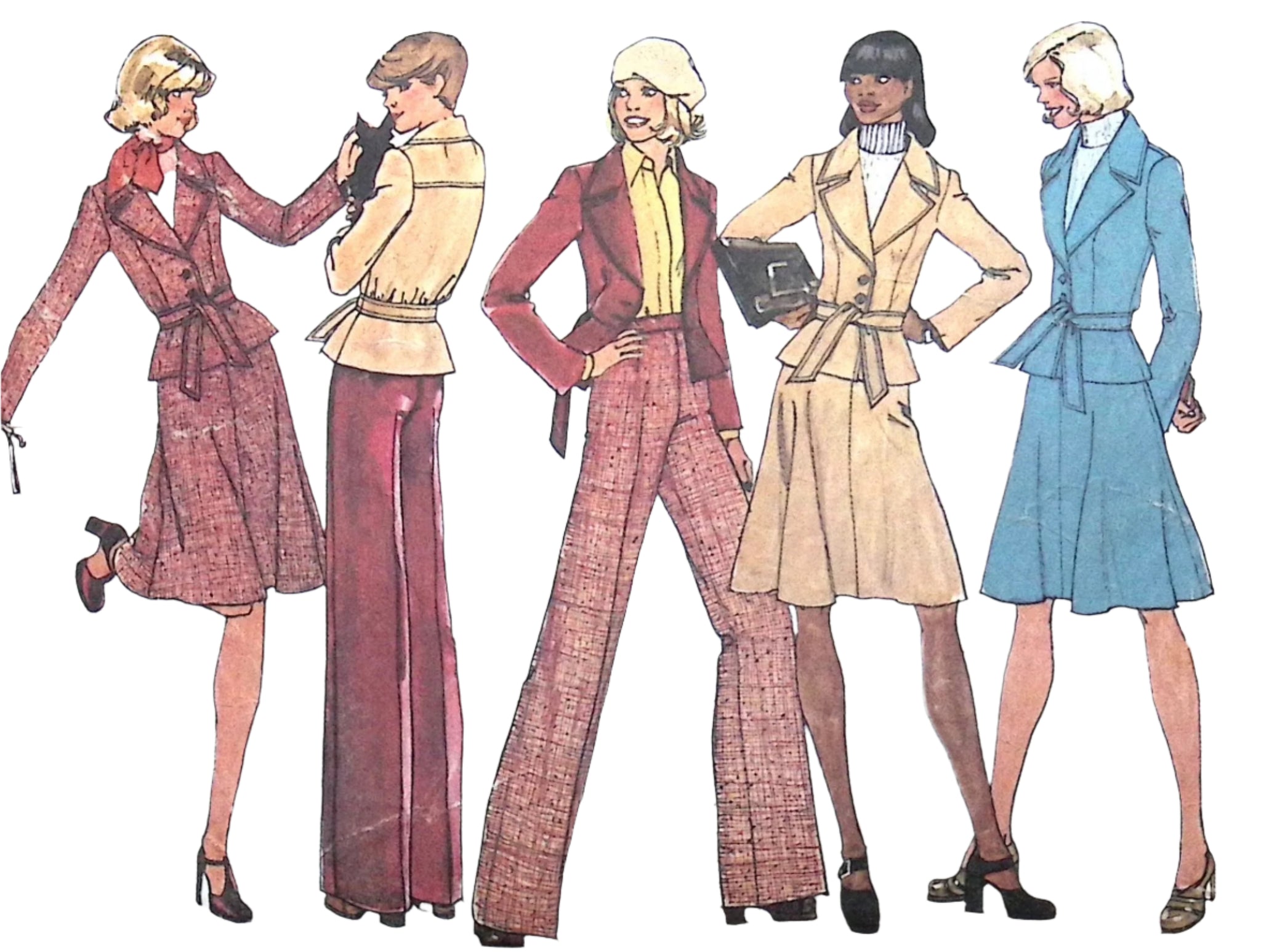 Misses' Jacket, Skirt & Pants: This vintage sewing pattern, Simplicity 6726, offers a stylish and versatile set for the fashionable misses. The lined jacket features a flattering peplum, while the skirt and pants both have a back zipper and waistband for a comfortable and flattering fit. Perfect for creating unique and trendy looks! ©1975.