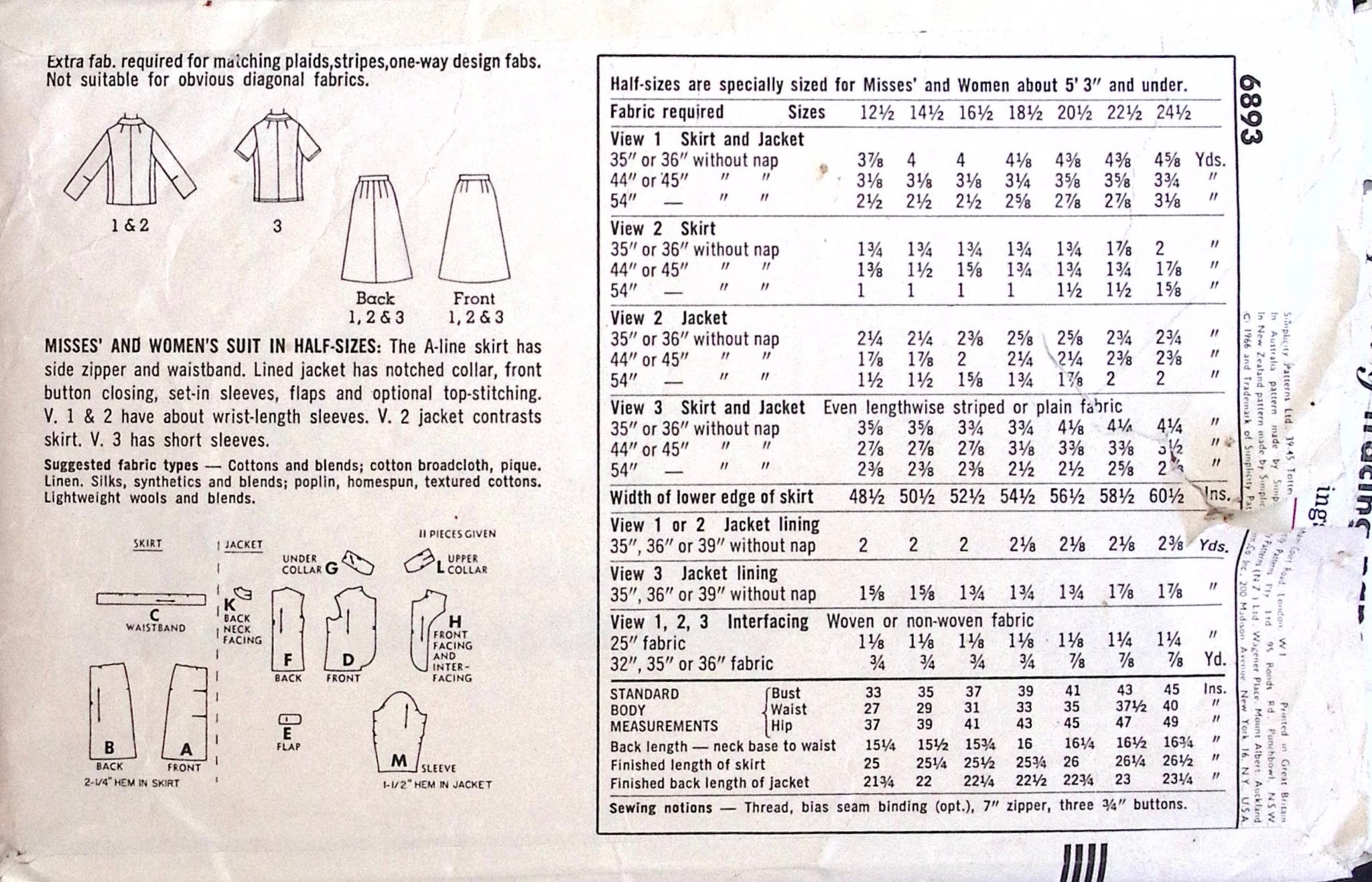 Misses' Suit: Revive your vintage style with Simplicity 6893! This retro suit pattern for misses and women includes a figure-flattering A-line skirt and a lined jacket with unique details (set-in sleeves, notch collar, and flaps). Optional topstitching adds a touch of sass! Get nostalgic with different sleeve lengths and contrast options! ©1966.