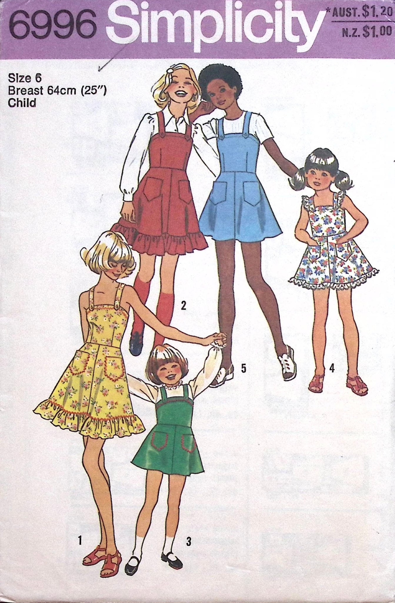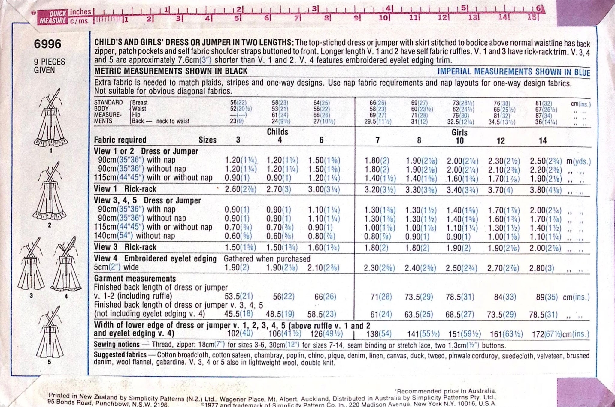 Child’s & Girls' Dress or Jumper: The top-stitched dress or jumper features a skirt stitched to the bodice above the normal waistline, complemented by a convenient back zipper, playful patch pockets, and self-fabric shoulder straps buttoned to the front. For an extra touch of flair, longer length options include self-fabric ruffles and trims, adding a whimsical twist to this delightful ensemble. ©1977.