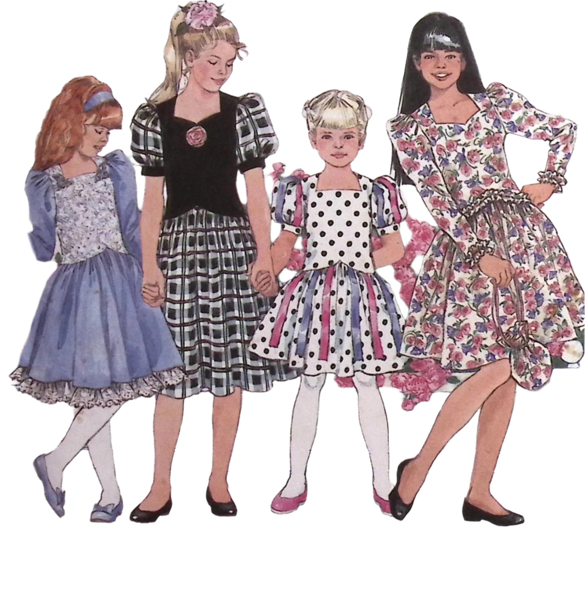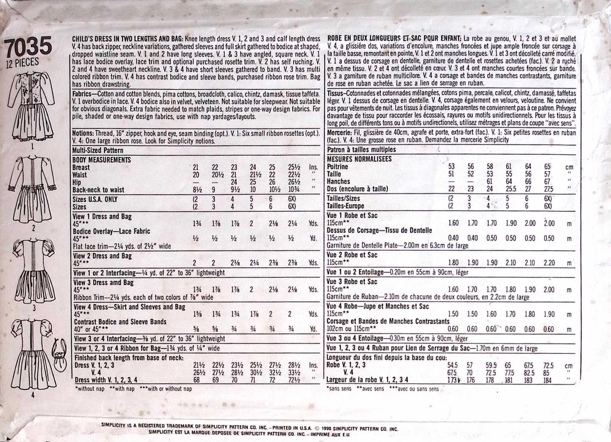 Child's Dress & Bag: Let your little one rock retro style with this vintage sewing pattern from the 1990s. Featuring a fitted bodice, full skirt, and puff sleeves, this Simplicity 7035 dress will have your child standing out from the crowd. Plus, with the option of short or long sleeves and a matching bag included, they'll be one stylish kid! ©1990.