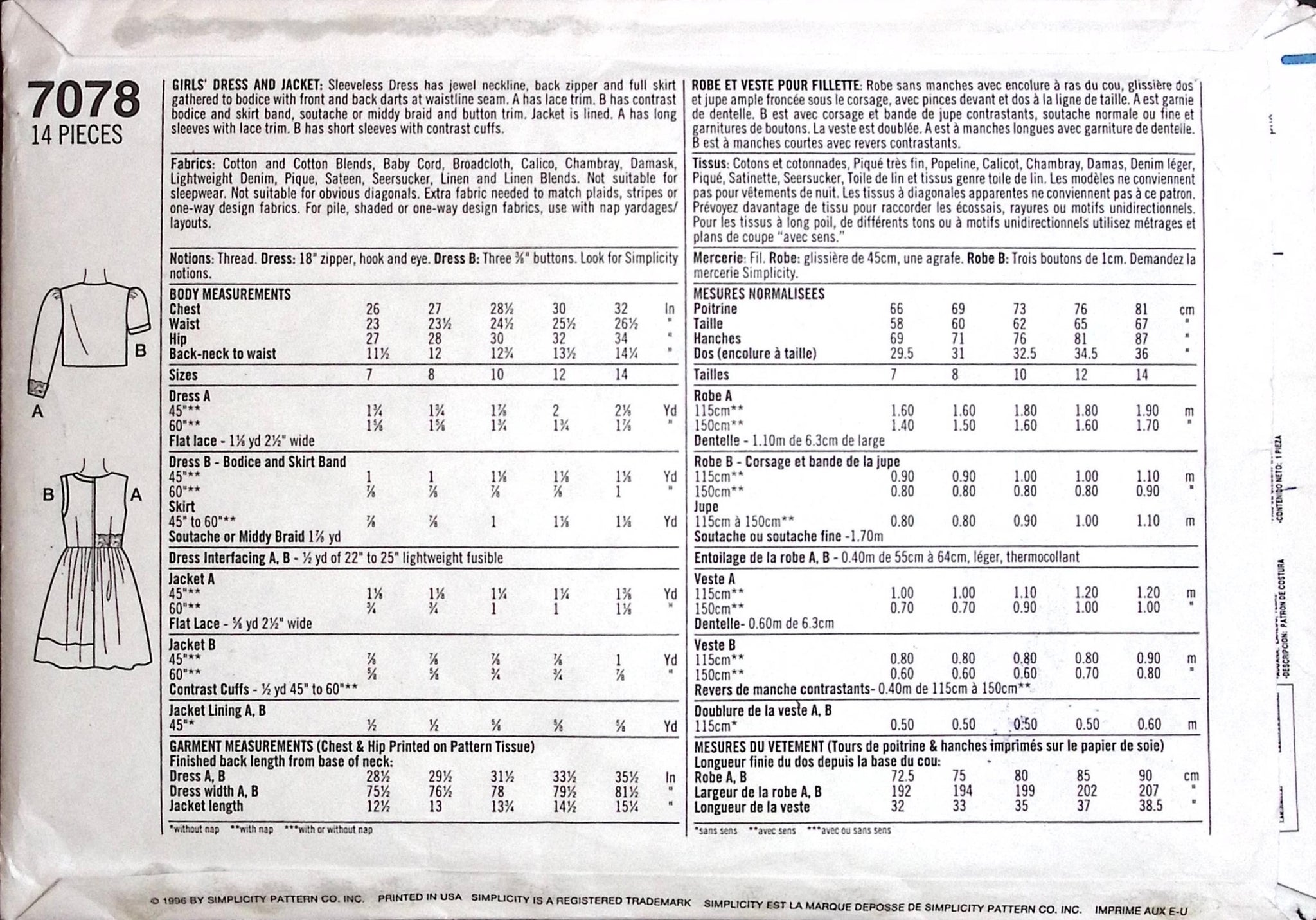 Girls Dress & Jacket: The jacket can be tailored with either short or long sleeves, providing versatility for different seasons. Meanwhile, the dress offers two different style options, ensuring plenty of variety in your little one's wardrobe. Whether it's a formal occasion or everyday wear, this pattern offers endless possibilities for stylish and adorable outfits. ©1996.