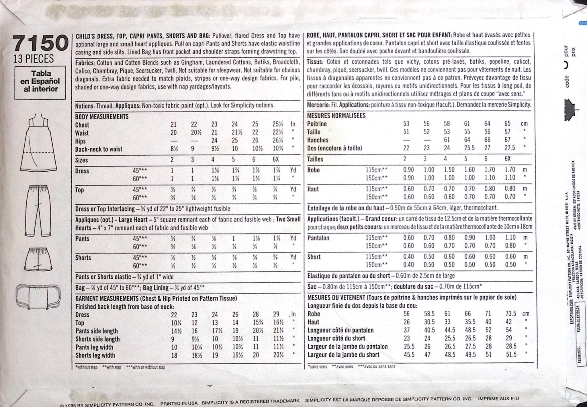 Child’s Dress, Top, Capri Pants, Shorts & Bag: The pullover, flared dress, and top feature optional large and small heart appliques for added charm. Meanwhile, the pull-on capri pants and shorts boast an elastic waistline casing and side slits for comfort and ease of movement. Complete the ensemble with the lined bag, which includes a front pocket and shoulder straps forming a drawstring top for practicality and style. ©1996.
