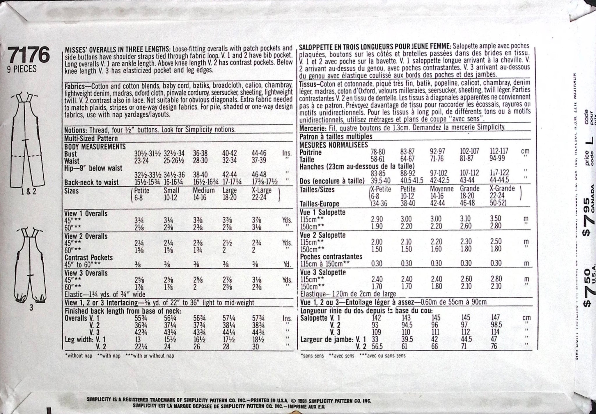 Misses' Overalls: Get ready to sew your own unique style with the Vintage Sewing Pattern: Simplicity 7176! These loose-fitting overalls come in three lengths and feature cute patch pockets and side buttons. Choose from ankle, above-knee, or below-knee lengths and add some fun with contrasting pockets and elasticised edges. (Get creative with your own fabric loop!) ©1991.