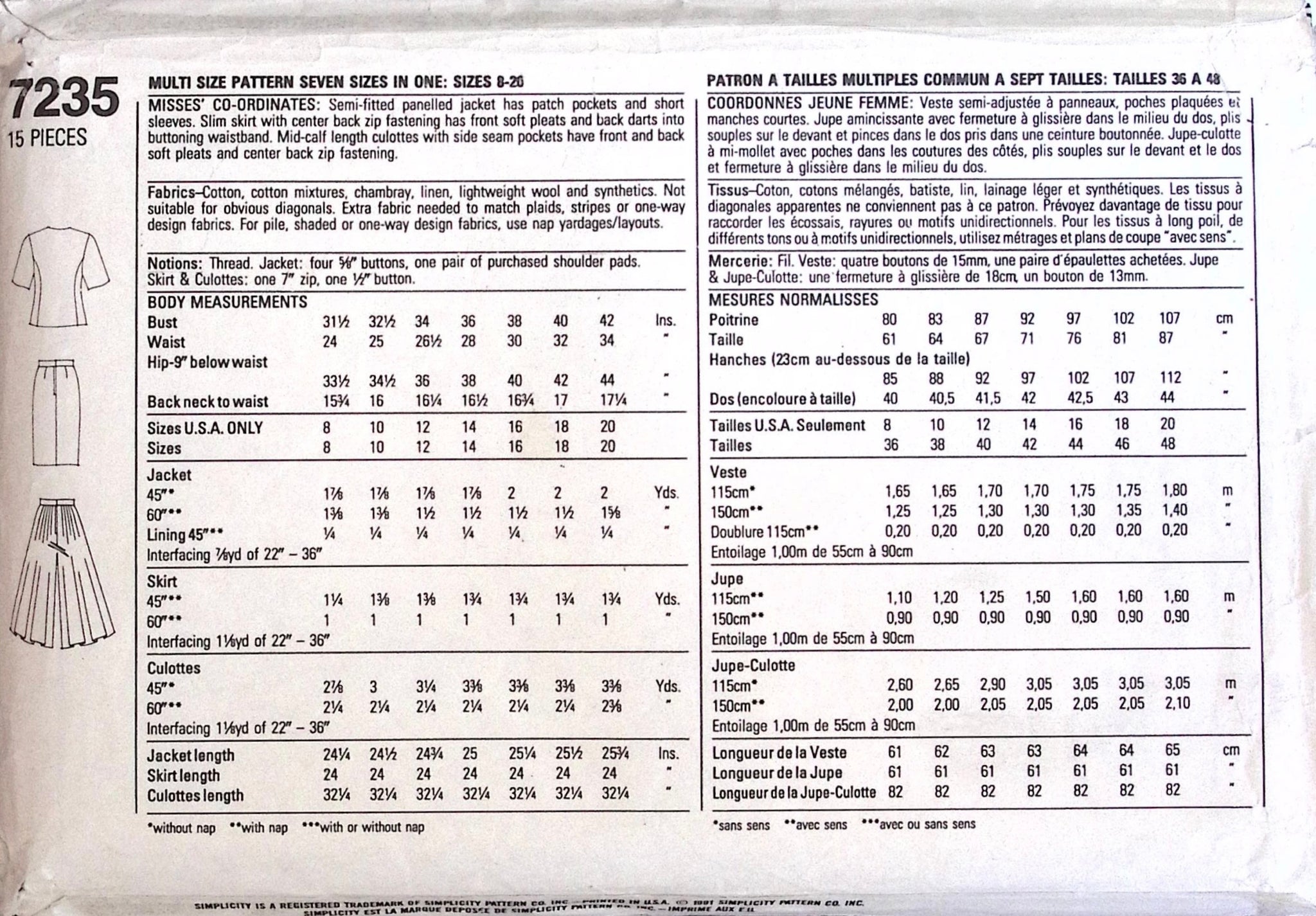 Misses' Co-ordinates: Create timeless fashion with the Simplicity 7235 sewing pattern. Make a semi-fitted jacket with pockets and short sleeves, along with a slim skirt or culottes. Elevate your style with these coordinating pieces. (Stitch up your new wardrobe with this vintage pattern - a perfect blend of classic and modern!) ©1991.