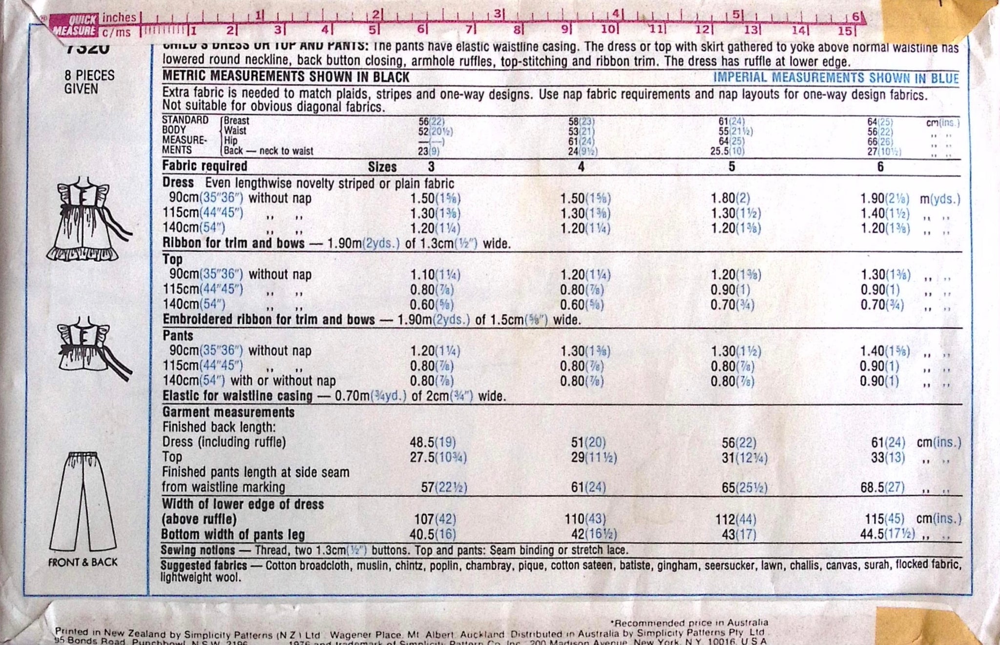 Child's Dress or Top & Pants: Get ready to sew up some fun with this vintage pattern from Simplicity! Choose between a dress or top with ruffled details and charming ribbon trim. Pants feature an elastic waistline for ease and comfort. Perfect for a playful and unique look! ©1976. RARE FIND!