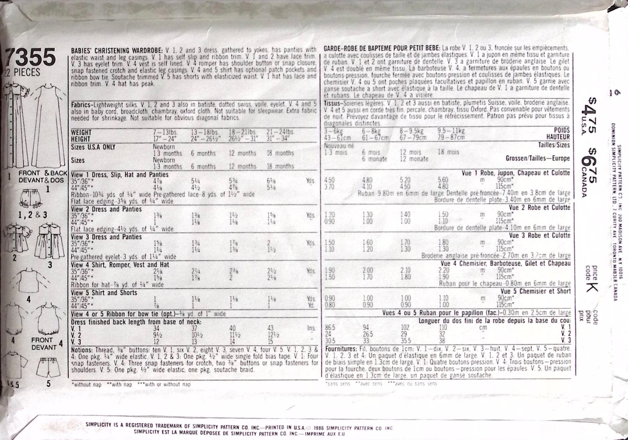 Babies’ Christening Wardrobe: The dress, gathered to the yoke, comes with accompanying panties featuring elastic waist and leg casings. Choose between a self-slip with ribbon trim, lace trim, or eyelet trim for added elegance. The self-lined vest adds a touch of sophistication to the ensemble. For a more playful look, opt for the romper with shoulder button or snap closure, snap-fastened crotch, and elastic leg casings. The accompanying shirt can be adorned with optional patch pockets and a ribbon bow tie. Complete the outfit with soutache-trimmed shorts featuring an elasticised waist and a hat with a peak for a stylish finishing touch. ©1986.
