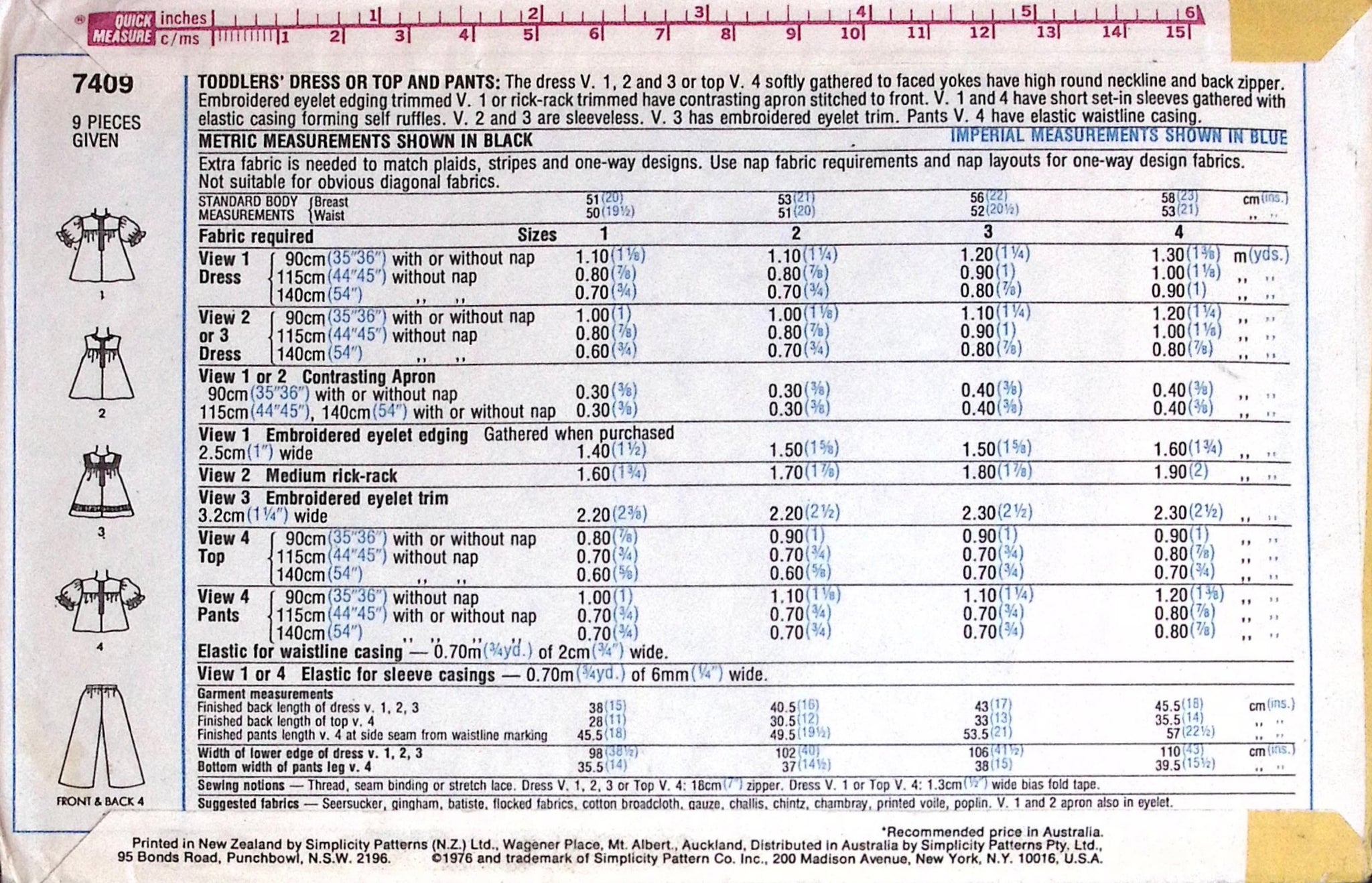 Toddlers’ Dress, Top & Pants: Options for dresses or tops with soft gathering at faced yokes, high round necklines, and back zippers. The garments can feature embroidered eyelet or rick-rack trim with contrasting aprons stitched to the front. Sleeve options include short set-in sleeves gathered with elastic casing for self-ruffles, sleeveless, or with embroidered eyelet trim. The accompanying pants have an elastic waistline casing for easy wear. ©1976.
