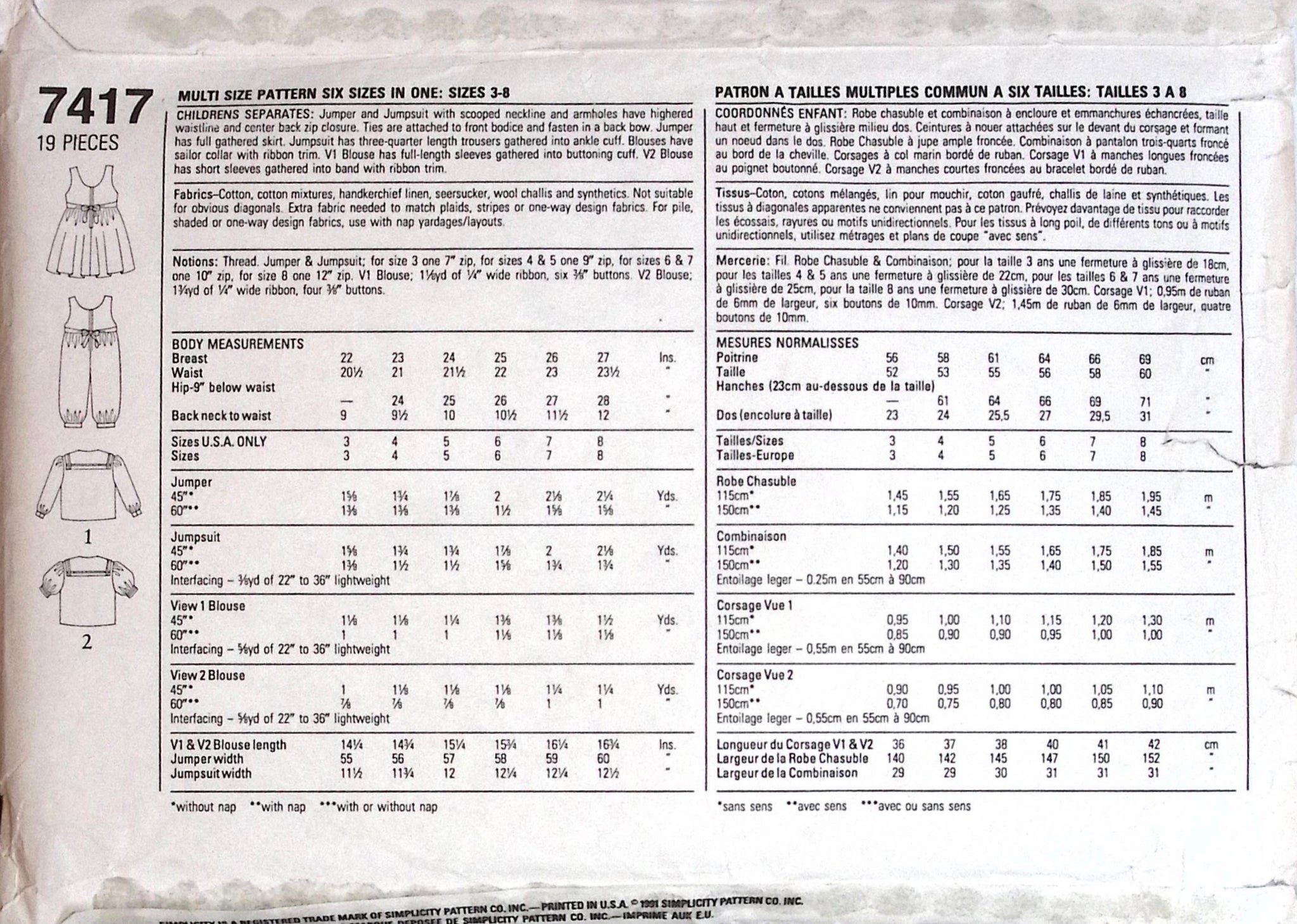 Children’s Separates: Pattern includes a jumper and jumpsuit featuring scooped necklines and armholes, with a raised waistline and a center back zipper. The jumper has a full gathered skirt, while the jumpsuit features three-quarter-length pants gathered into cuffs. Both garments have ties attached to the front bodice. Blouses in the pattern come with a sailor collar and options for short or long sleeves, providing a variety of styling choices for a versatile wardrobe. ©1991.