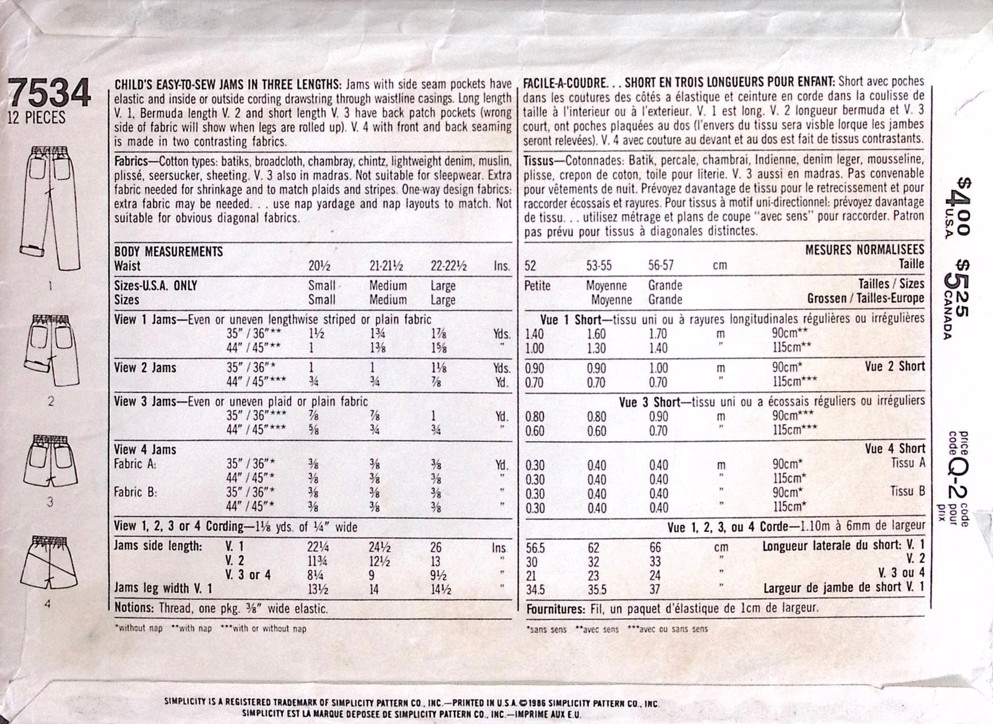 Child's Jams in Three Lengths: Get ready to sew some style! This vintage sewing pattern from Simplicity offers three lengths of 1980's kids jams. Express your creativity and make your child's wardrobe unique with these funky and fun jam options. Perfect for any fashion-forward child! ©1986.