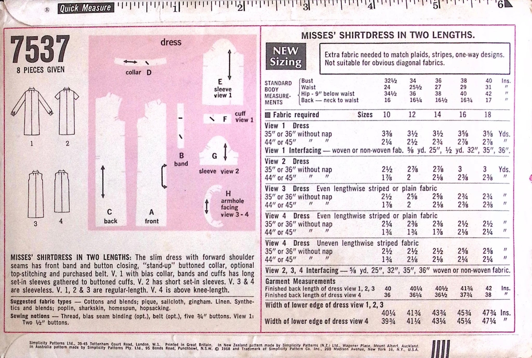 Misses' Shirtdress: "Revamp your wardrobe with this charming Vintage Sewing Pattern: Simplicity 7537. The slim, button-up dress offers versatile options with different sleeve lengths and a choice of collar styles. The perfect blend of elegance and comfort, this dress is ready to make a statement! ©1968.