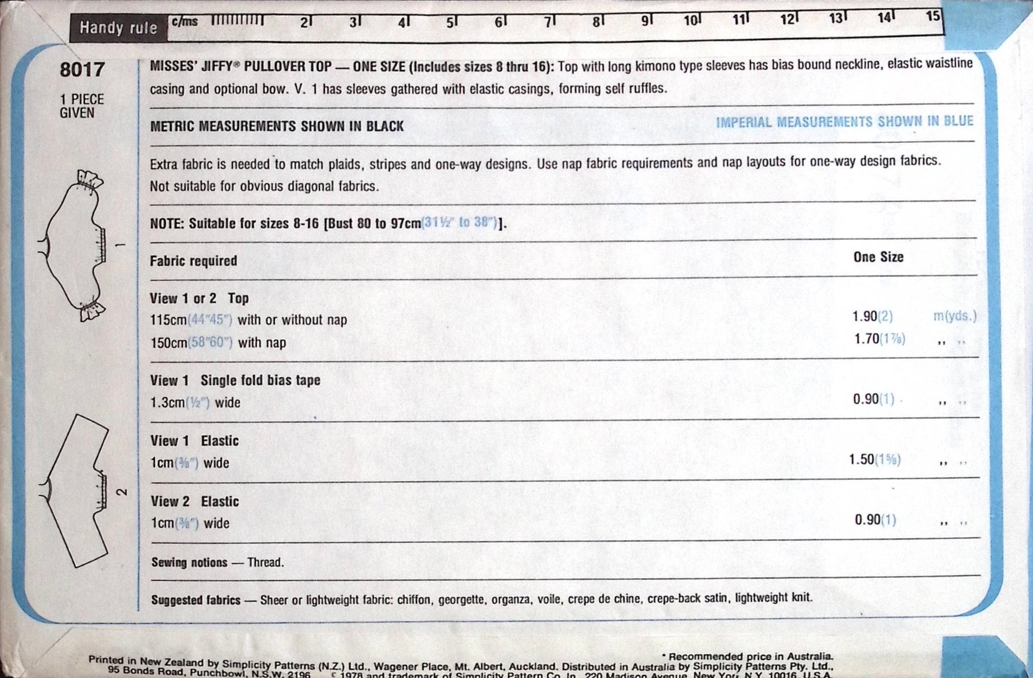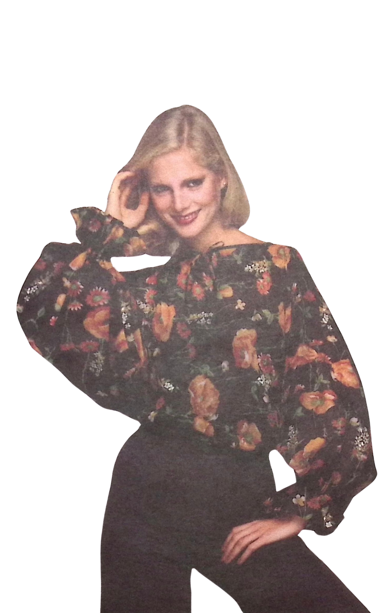 Misses’ Top: This retro-inspired design features long kimono-type sleeves and a bias-bound neckline for a chic and elegant look. The elastic waistline casing adds comfort and versatility, while the optional bow detail offers a charming finishing touch. You can also choose the gathered sleeves with elastic casing, creating self-ruffles at the wrist for added flair. With its timeless design and versatile options, this pattern allows you to create a vintage-inspired top that's perfect for any occasion. ©1978.