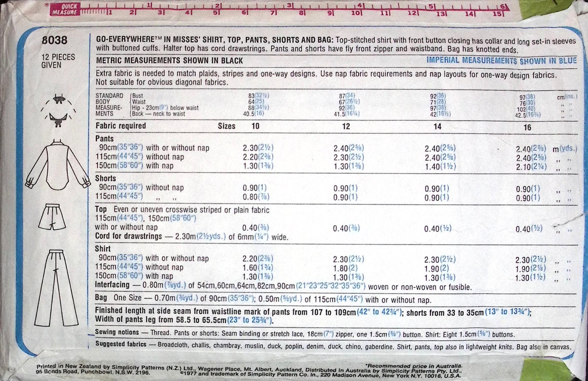 Misses’ Shirt, Top, Pants & Bag: The top-stitched shirt, featuring a front button closing, presents a polished look with a classic collar and long set-in sleeves adorned with buttoned cuffs. For a more laid-back vibe, the halter top boasts chic cord drawstrings. The pants and shorts, equipped with a fly front zipper and waistband, provide comfort and style for any outing. Complete the ensemble with a knotted-ends bag, adding a touch of bohemian flair. This pattern ensures you're ready for any adventure, blending retro charm with contemporary functionality for a wardrobe that can truly go everywhere. ©1977.