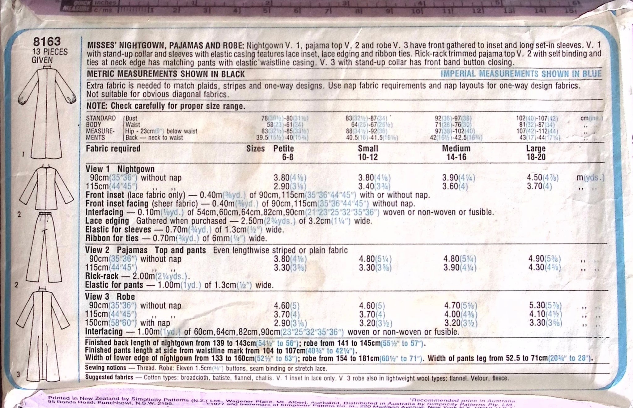 Misses’ Nightgown, Pyjamas & Robe: Experience ultimate comfort and style. Choose from three versatile versions featuring gathered inset and set-in sleeves, lace details, ribbon ties, and more. Whether you prefer a nightgown, pyjama top, or robe, this vintage design will keep you feeling cozy and chic. ©1977.