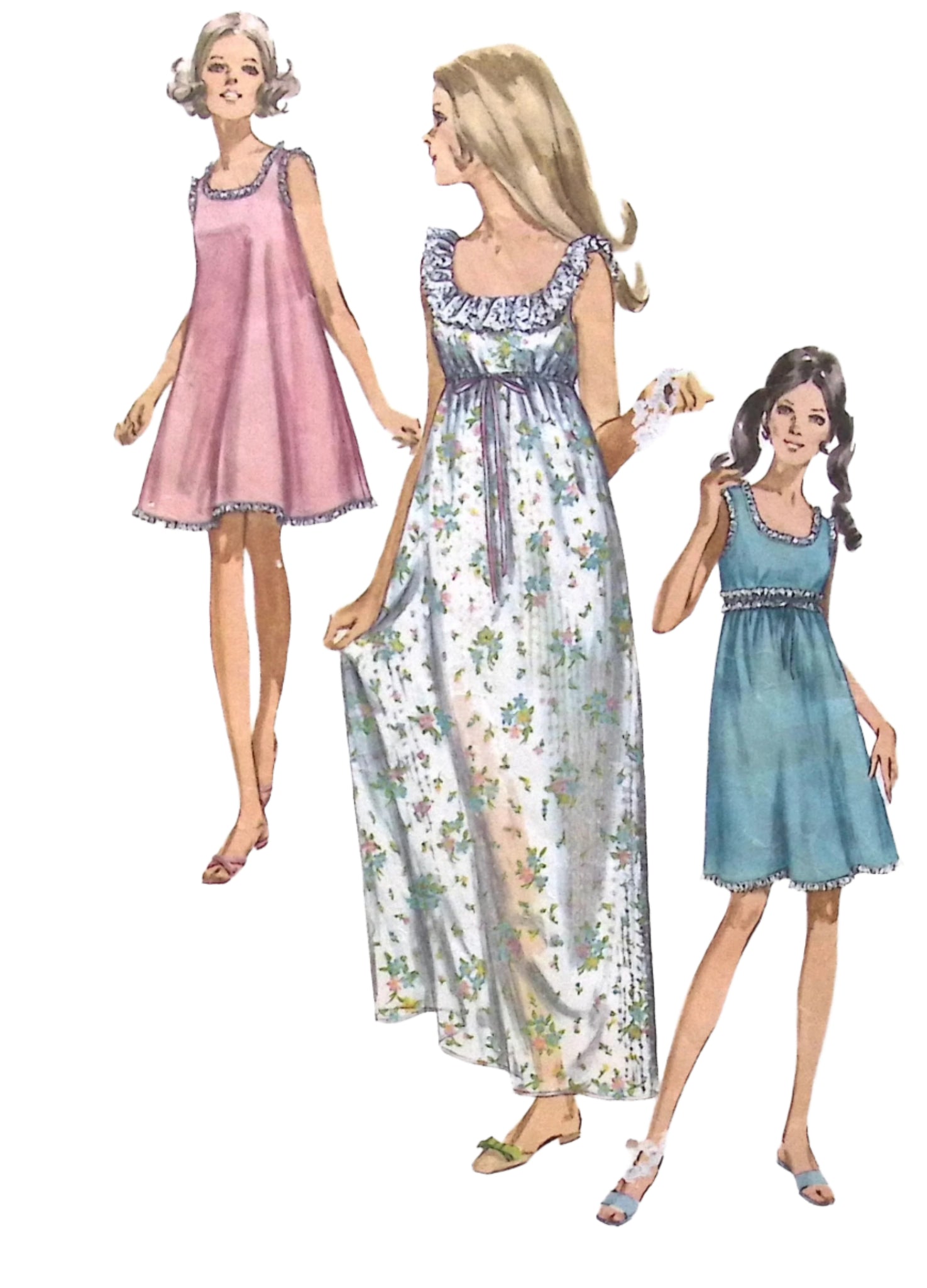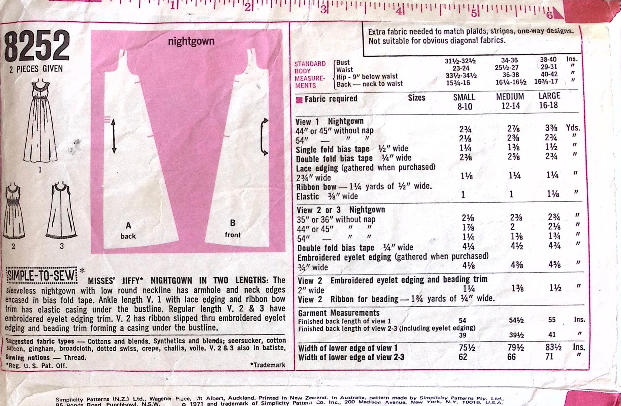 Misses' Nightgown in Two Lengths: Get cozy with this vintage sewing pattern from the 60's. Simplicity 8252 offers a simple-to-sew jiffy nightgown in two lengths. With a low round neckline and beautiful lace and ribbon trim details, you'll feel effortlessly elegant. Perfect for a lazy Sunday morning or a romantic evening in. ©1969. RARE FIND!