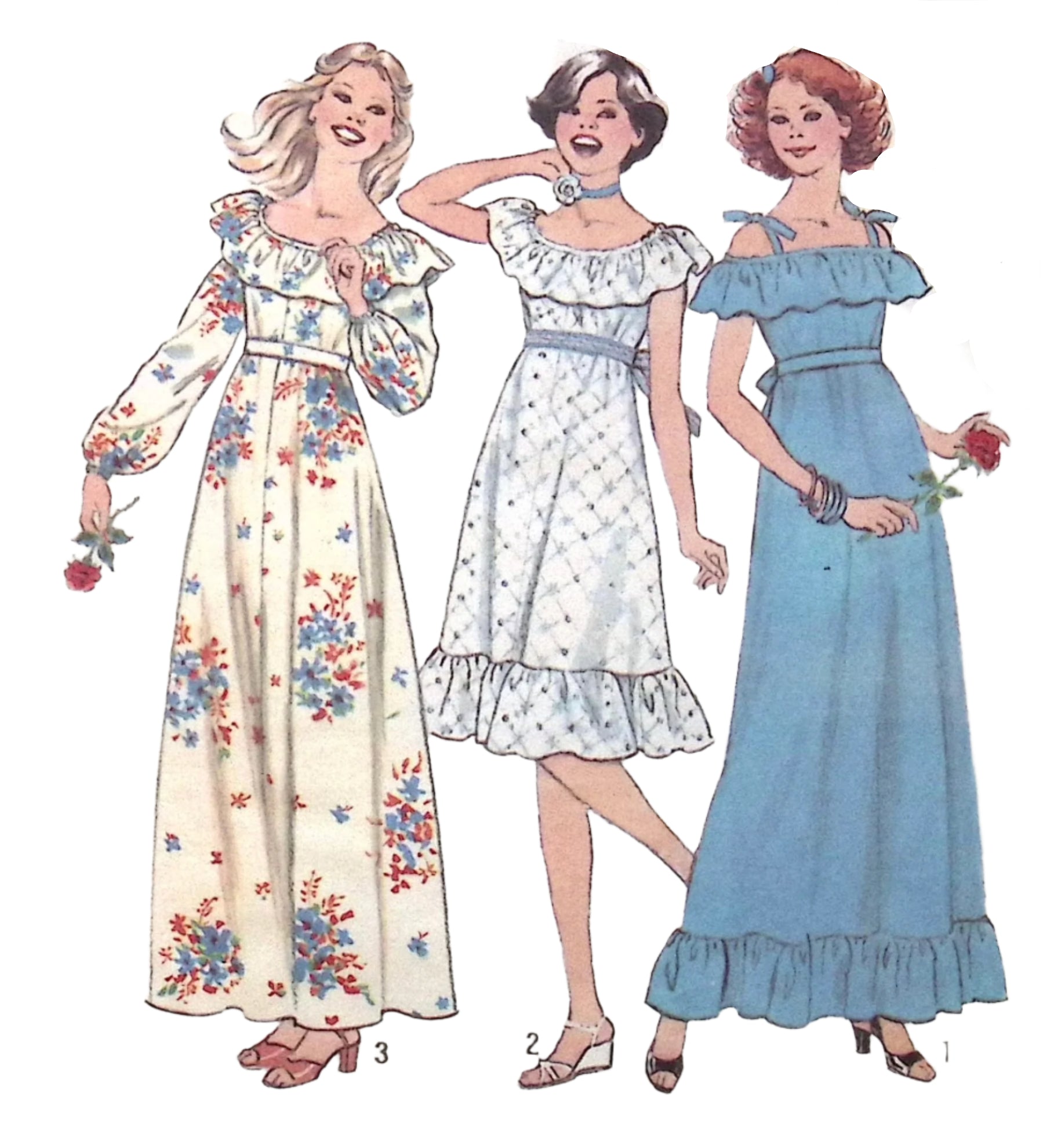 Misses' Dress: This playful pullover dress from the 70's features a ruffled neckline with optional lower ruffle and shoulder ties. Choose between sleeveless or long raglan sleeves, and complete the look with an elastic encased tie belt. Get ready to turn heads with this unique piece! ©1977.