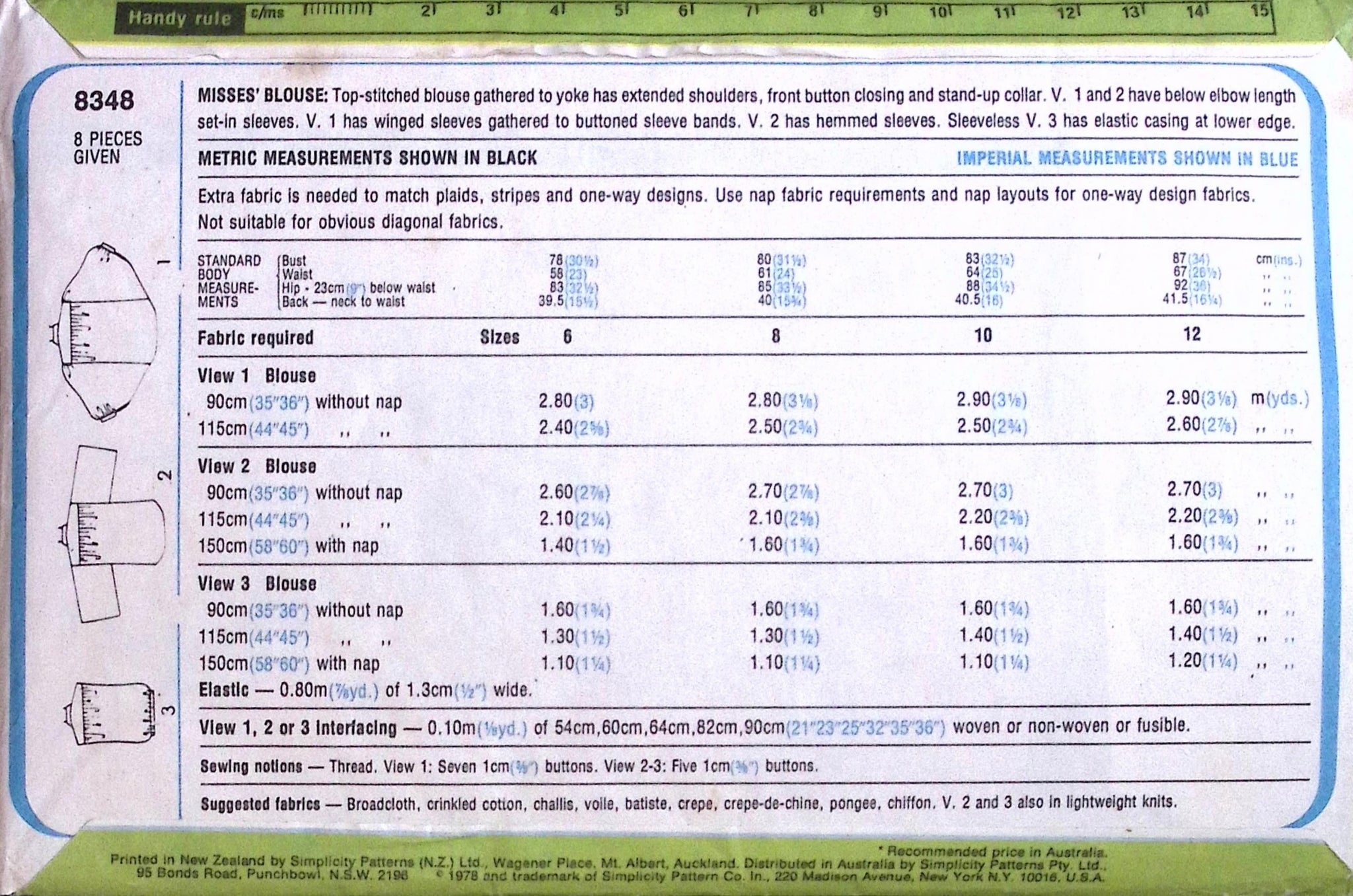 Misses' Blouse: This vintage sewing pattern makes creating unique and stylish blouses a breeze. The top stitched blouse is gathered to a yoke and features extended shoulders, a front button closure, and a stand-up collar. Choose from a variety of sleeve options, including winged sleeves and elastic lower edge. The perfect addition to any wardrobe! ©1978.