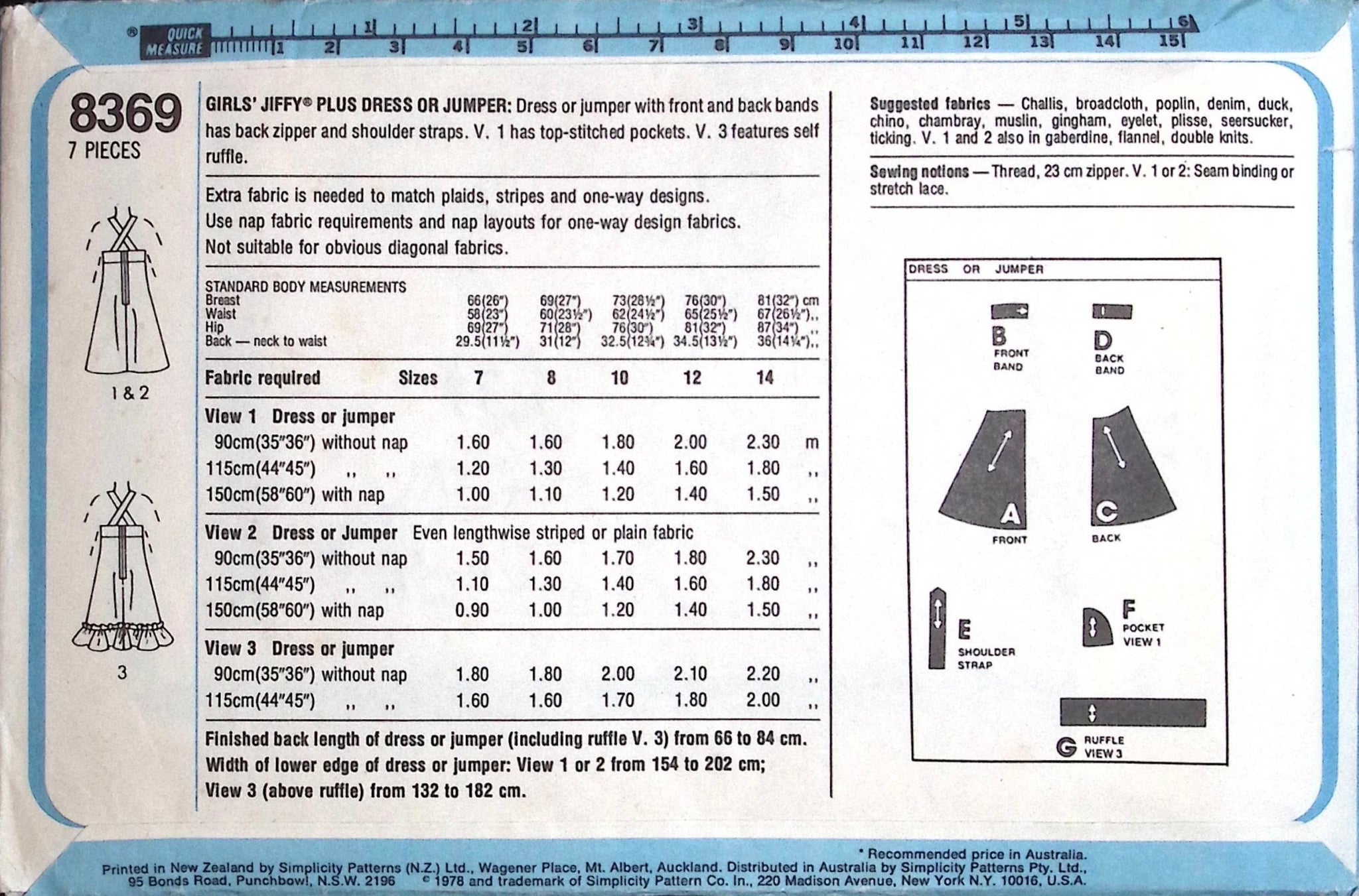 Girl’s Dress or Jumper: This charming design features a dress or jumper with front and back bands, complete with a convenient back zipper and shoulder straps for easy wearing. You have the option to add top-stitched pockets or a self ruffle for extra flair and personality. Whether you're aiming for a cute and casual look or a charming retro ensemble, this pattern provides endless possibilities for creating stylish and comfortable outfits for your little one. ©1978.