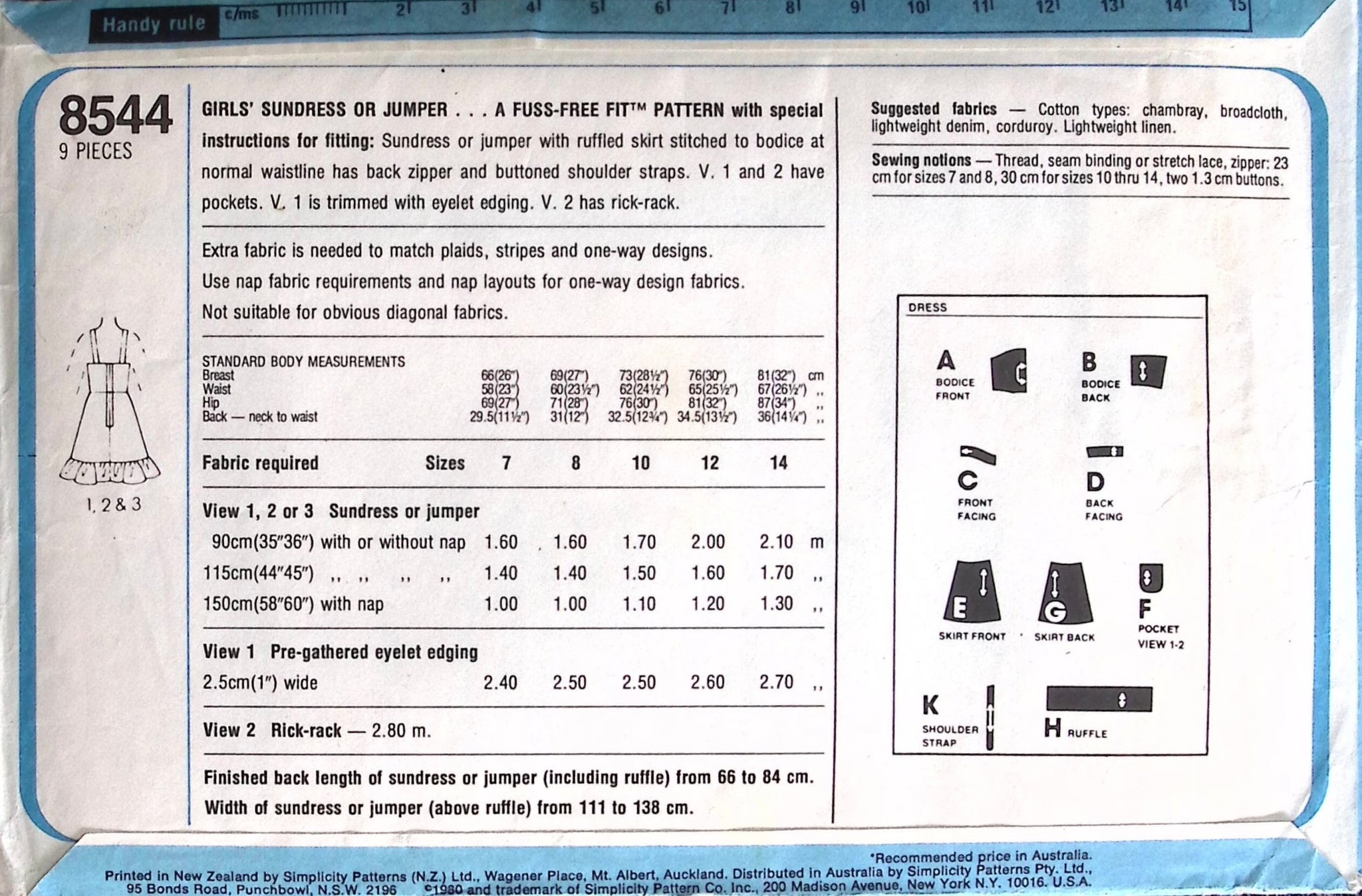 Girl’s Dress or Jumper: Featuring a bodice attached at the natural waistline, this design boasts both a back zipper and buttoned shoulder straps for easy dressing. Choose between the convenience of pockets or keep it sleek without. Labeled as Fuss-Free Fit, this pattern includes special instructions for fitting, ensuring a perfect, comfortable garment every time. Get ready to create a darling dress that combines retro flair with modern ease! ©1980.