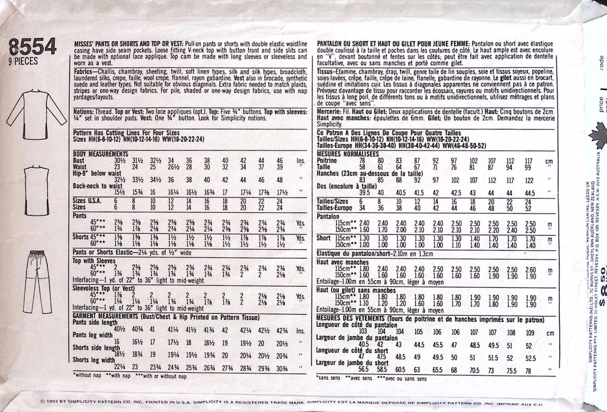 Misses' Pants, Shorts, Top & Vest: American Classics! Stitch together your vintage style with Simplicity 8554! These versatile 90's Misses' pants or shorts, paired with a top or vest, create your perfect retro look. Get crafty and stay stylish! ©1993.