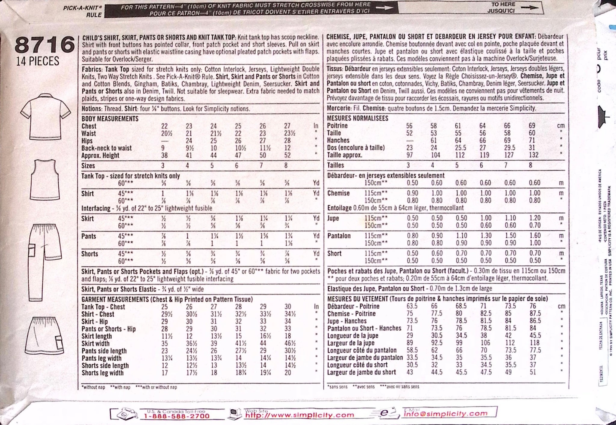 Child's Shirt, Skirt, Pants, Shorts & Tank Top: Add a touch of vintage flair to your child's wardrobe with this sewing pattern from Simplicity 8716. With options for a knit tank top, button-up shirt, skirt, pants, and shorts, your little one will have endless outfit possibilities. Plus, with front pockets and elastic waistbands, comfort and style are guaranteed! ©1999.