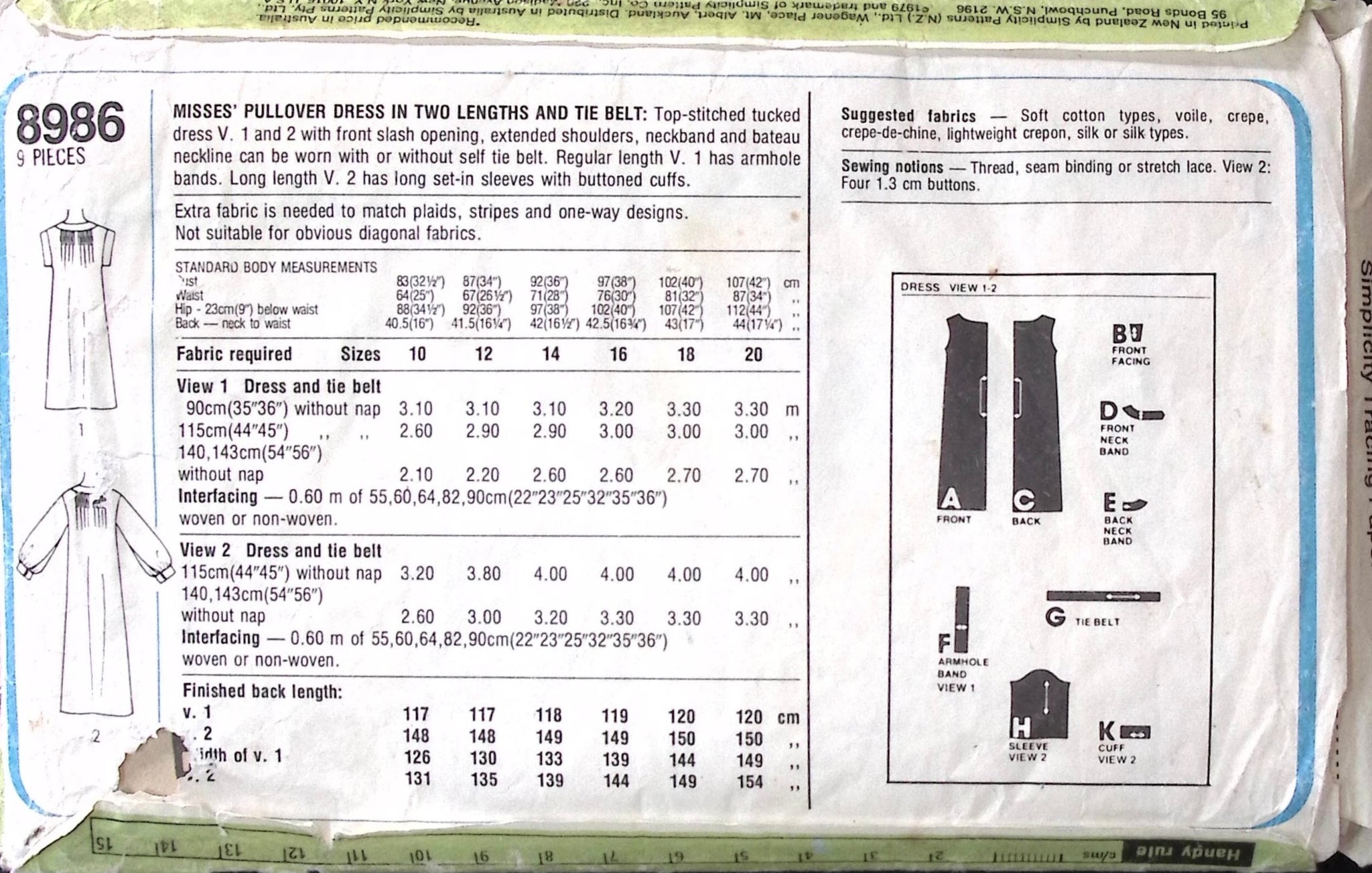 Misses' Dress & Tie Belt: Upgrade your wardrobe with a touch of vintage charm with our Simplicity 8986 dress pattern! Create a versatile pullover dress with tie belt or a top-stitched tuck dress with a front slash opening and short or long sleeves. Perfect for any occasion, this dress will surely turn heads! (1970's vibes included!) ©1979.