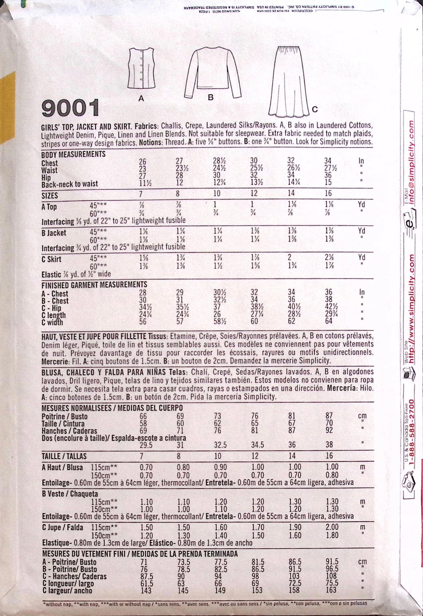 Girl's Top, Jacket & Skirt: Stitch together a stylish look with the Vintage Sewing Pattern: Simplicity 9001. This fun pattern allows you to create a sleeveless top jacket and skirt for girls. Upgrade your wardrobe with ease and vintage flair! ©1999.