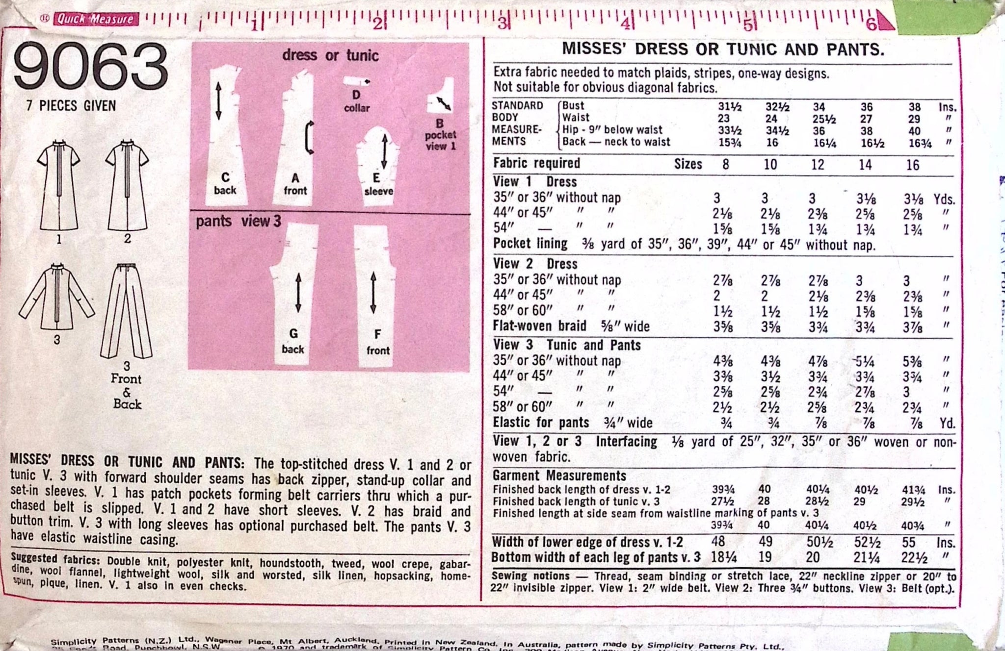 Misses' Dress or Tunic & Pants: Get retro chic with the Vintage Sewing Pattern: Simplicity 9063! This 70's design offers a sleek tunic or dress with optional cargo pockets and a choice of long or short sleeves. Revamp your wardrobe with this versatile pattern. ©1970.